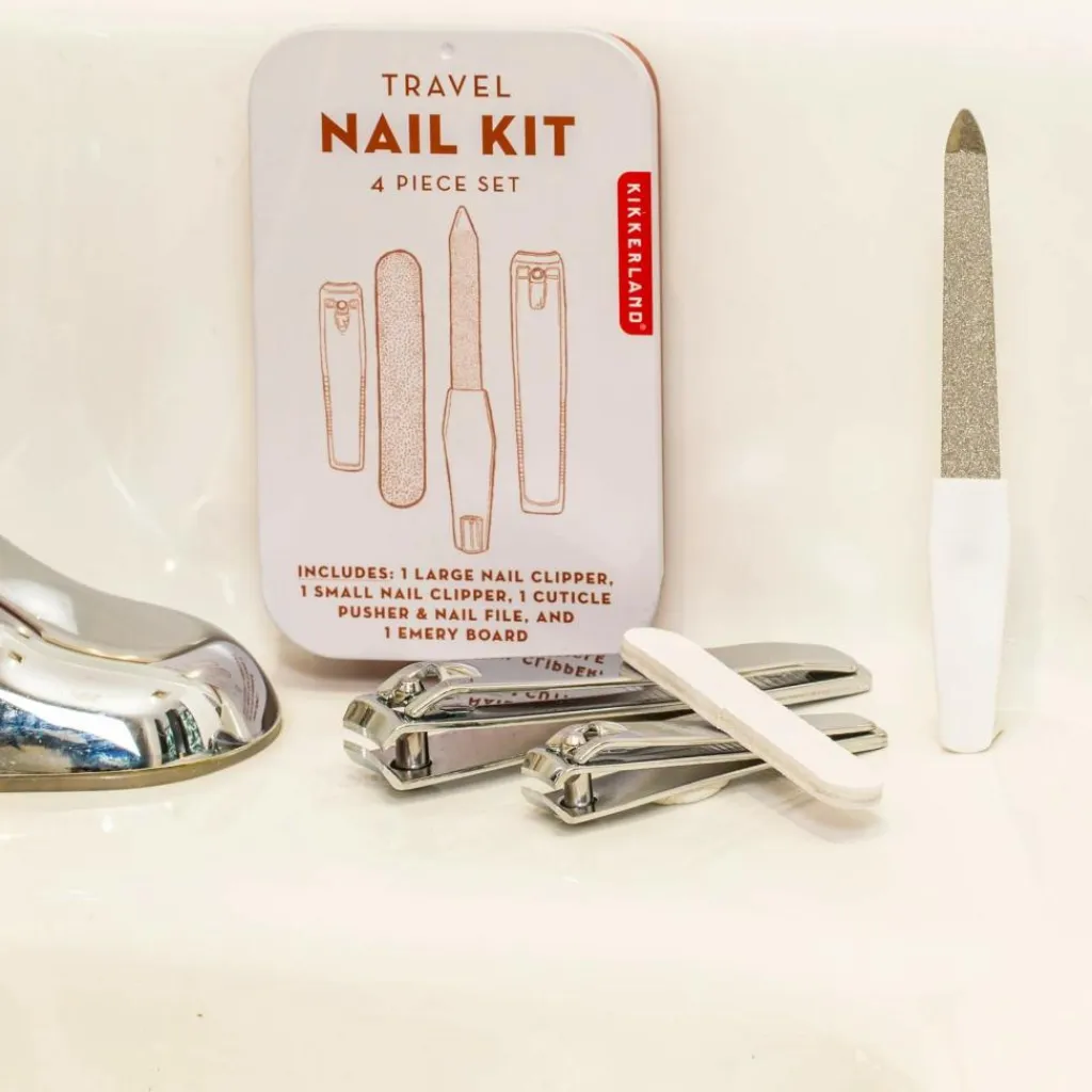 Reisekit für Nagelpflege in praktischer Blechdose, das immer mit dabei ist. Enthalten sind zwei Nagelknipser (groß und klein), eine Nagelfeile und ein Nagelhautschieber sowie vier Acetontücher.