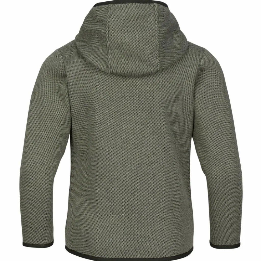 Die Innenseite der Kapuzenjacke hat einen glatten, weichen Griff, während die Außenseite in dezenter Strick-Optik schön robust ist. Der Mix aus Kunstfaser und Baumwolle hält die Kids warm, ob abends beim Campen, bei windigem Wetter am Strand oder einfach im Alltag. Der Kunstfaser-Anteil beschleunigt den Feuchtigkeitstransport und lässt die Jacke im Vergleich zu einer reinen Baumwoll-Jacke schneller trocknen. So liegt sie recht zügig wieder trocken auf der Haut, wenn die Kinder beim Drachen steigen lassen oder Fußball spielen ins Schwitzen geraten sind.