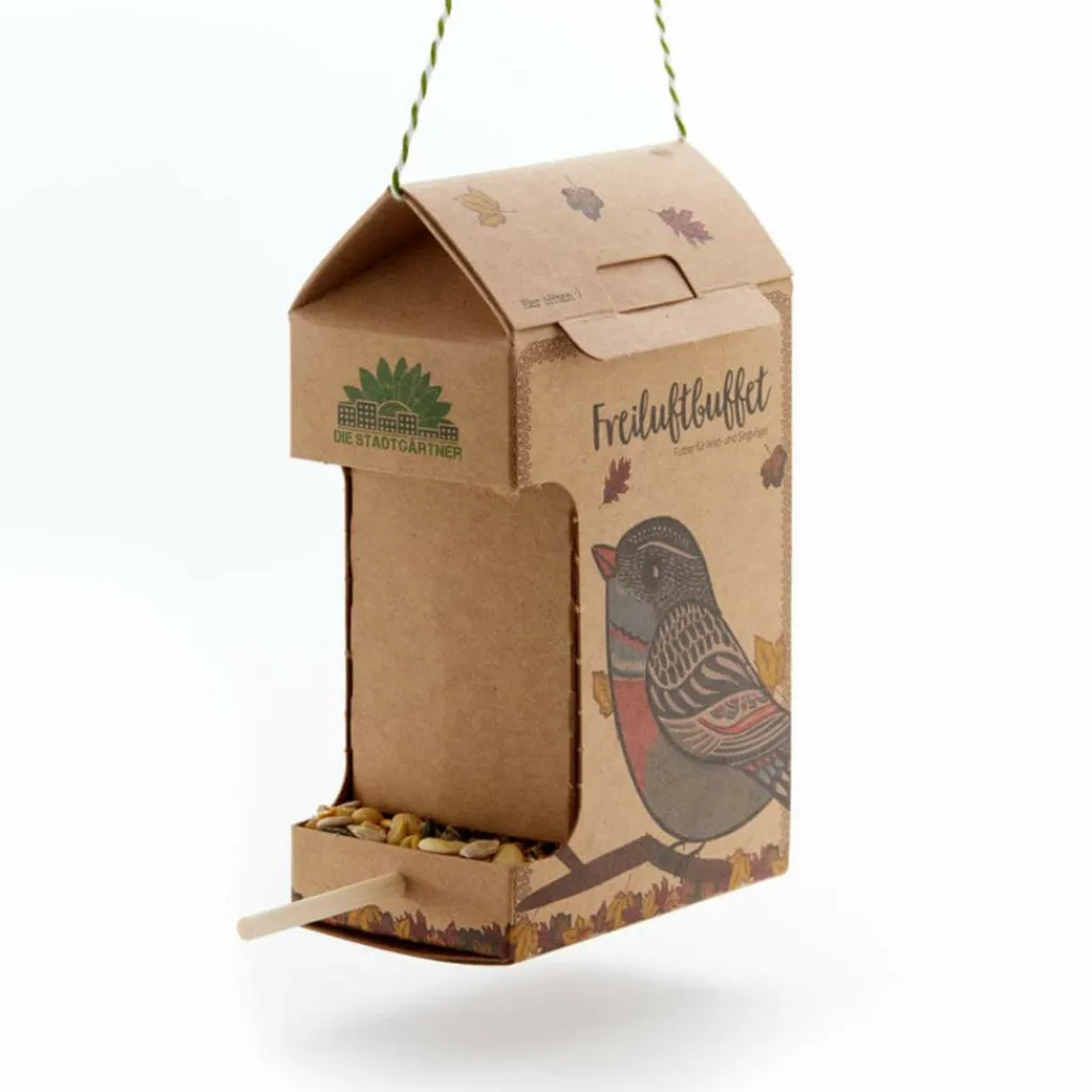 Die Futterstelle aus Naturkarton ist unkompliziert in der Befüllung und Aufhängung. Auf der stabilen Sitzstange aus Holz können deine gefiederten Freunde bequem Platz nehmen und sich nach Herzenslust bedienen. Die Futterstation enthält eine Schnur zur Aufhängung, 200 Gramm leckeres Futter und eine Sitzstange.