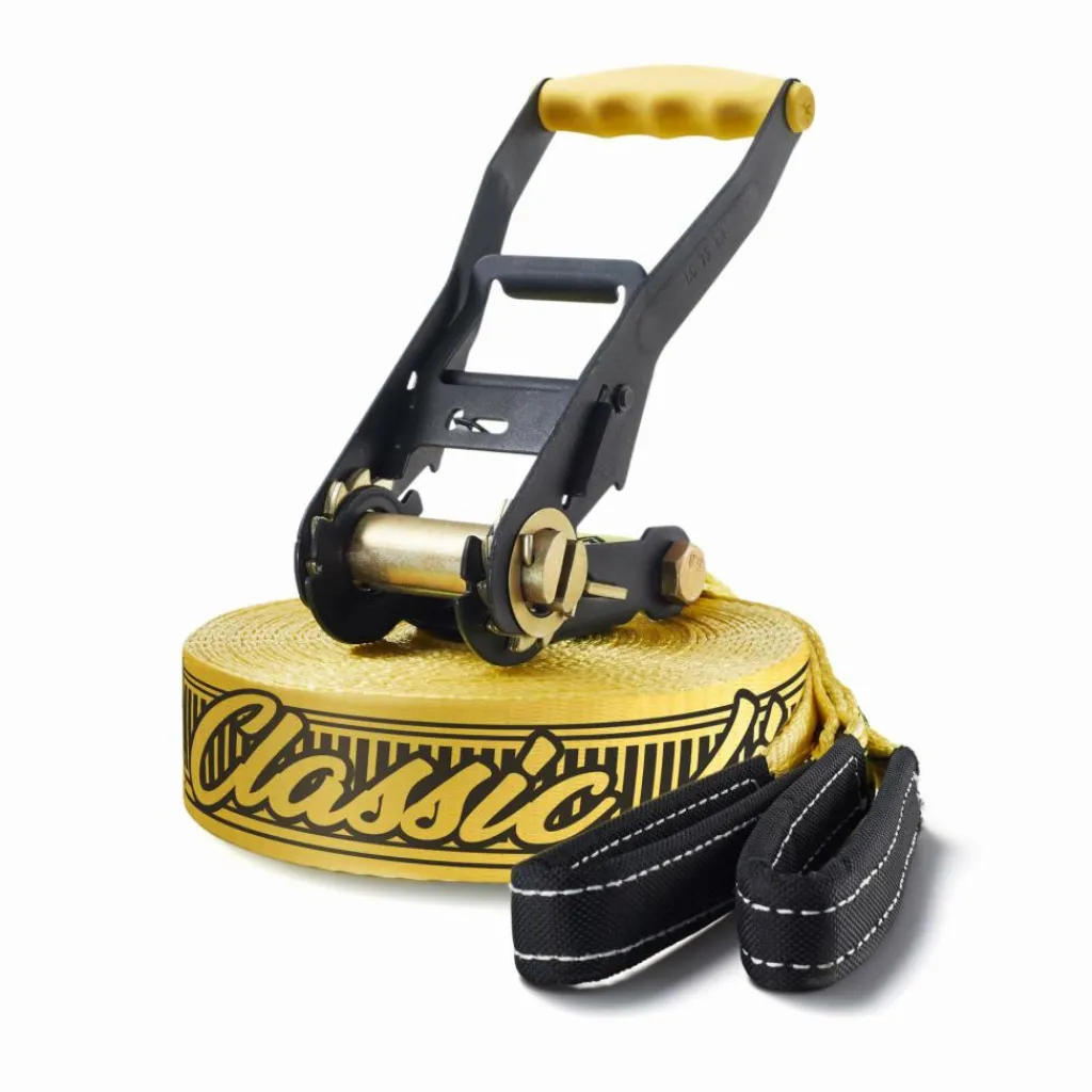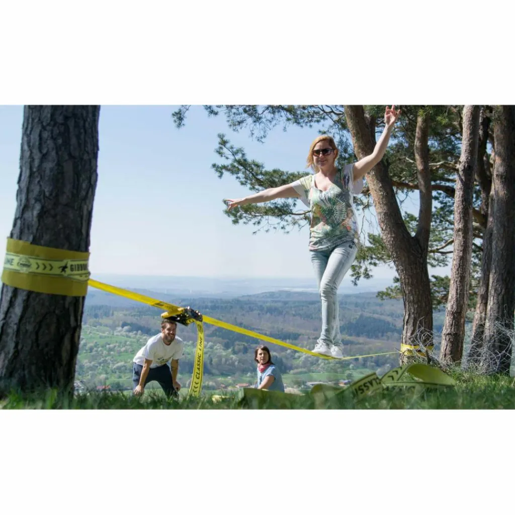 Die Classic Line in 15 m Länge und 5 cm Breite ist die optimale Slackline für Einsteiger und Familien. Auch im Bereich Fitness und Physiotherapie wird sie gern eingesetzt.
