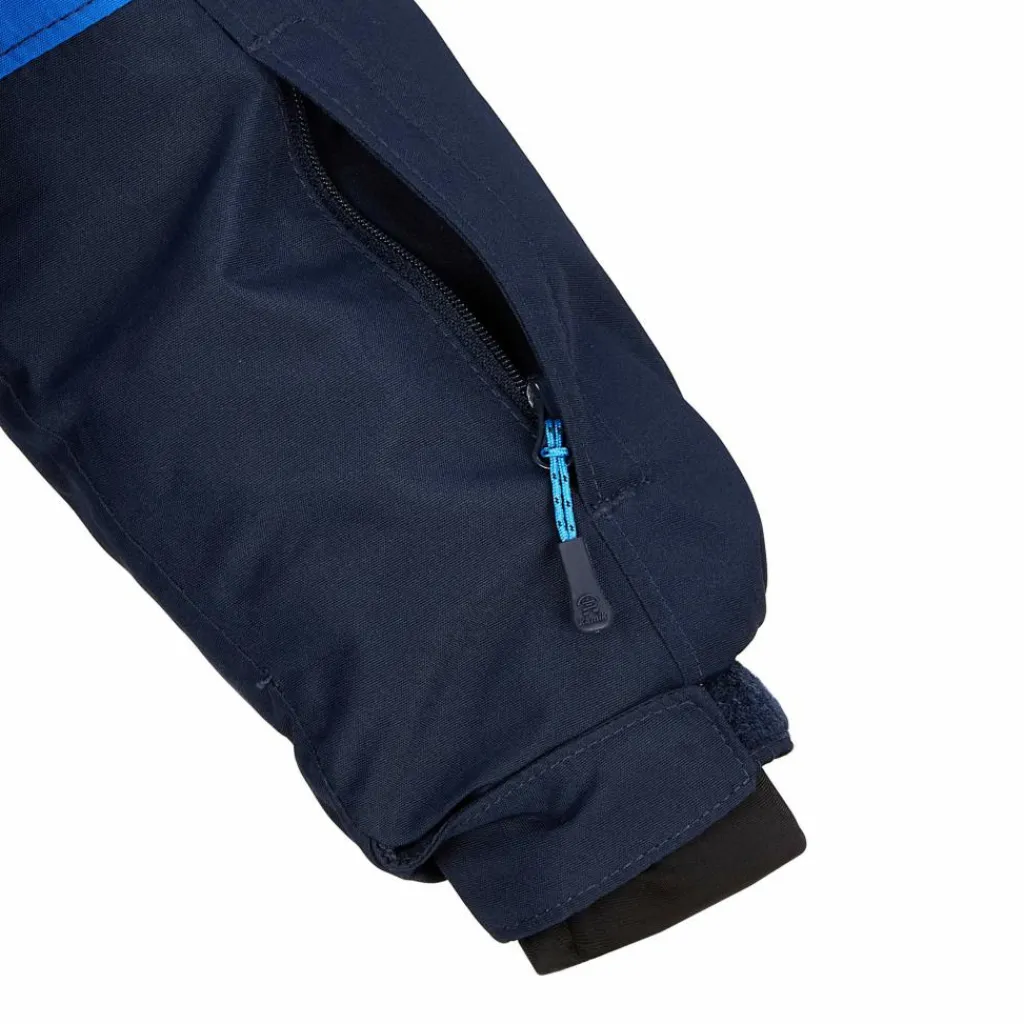 Mit ihren insgesamt sechs Taschen (darunter eine Skipasstasche am Ärmel) bietet die Jacke genügend Stauraum für Mütze, Handschuhe und jede Menge anderer Kleinigkeiten. Die Kapuze lässt sich per Klettverschluss im Volumen regulieren. Bei trockenem Wetter kann sie aber auch einfach abgetrennt werden, damit sie nicht im Weg ist. Die Ärmelbündchen lassen sich per Klettverschluss in der Weite regulieren. Die integrierten Stulpen in den Ärmelbündchen verhindert, dass sie Kälte entweichen kann. Innen an den Unterarmen befindet sich eine farblich abgesetzte Naht. Diese kann aufgetrennt werden, sodass sie Ärmel um ca. 4 cm länger werden. Perfekt für alle Kids, denen man beim Wachsen fast schon zugucken kann.
