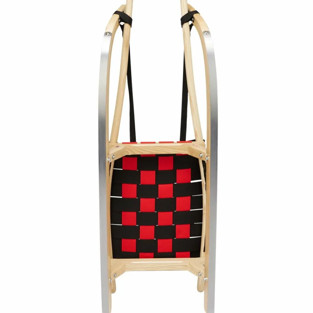 Durch eine niedrige Sitzposition und gummigelagerte Berührungspunkte zwischen Sitz und Kufen lässt sich der Tourenrodel einfach durch Gewichtsverlagerung und Ziehen am Bockband lenken. Für gute Fahreigenschaften und Spurtreue, auch auf harten Pisten, sorgen die mit Stahlschienen beschlagenen Eschenholzkufen mit einer Kufenneigung von 15° und einer Spurbreite von 46 cm.