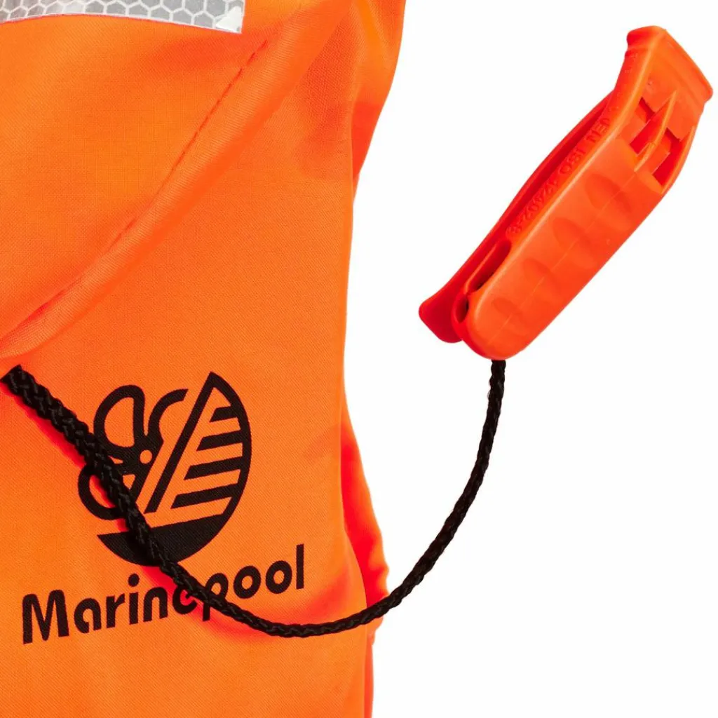 Durch die unterteilten Auftriebskörper passt sich die Rettungsweste sehr gut an und sitzt bequem. Der Kordelzug am Kragen und der Taillegurt erlauben eine genaue Anpassung.