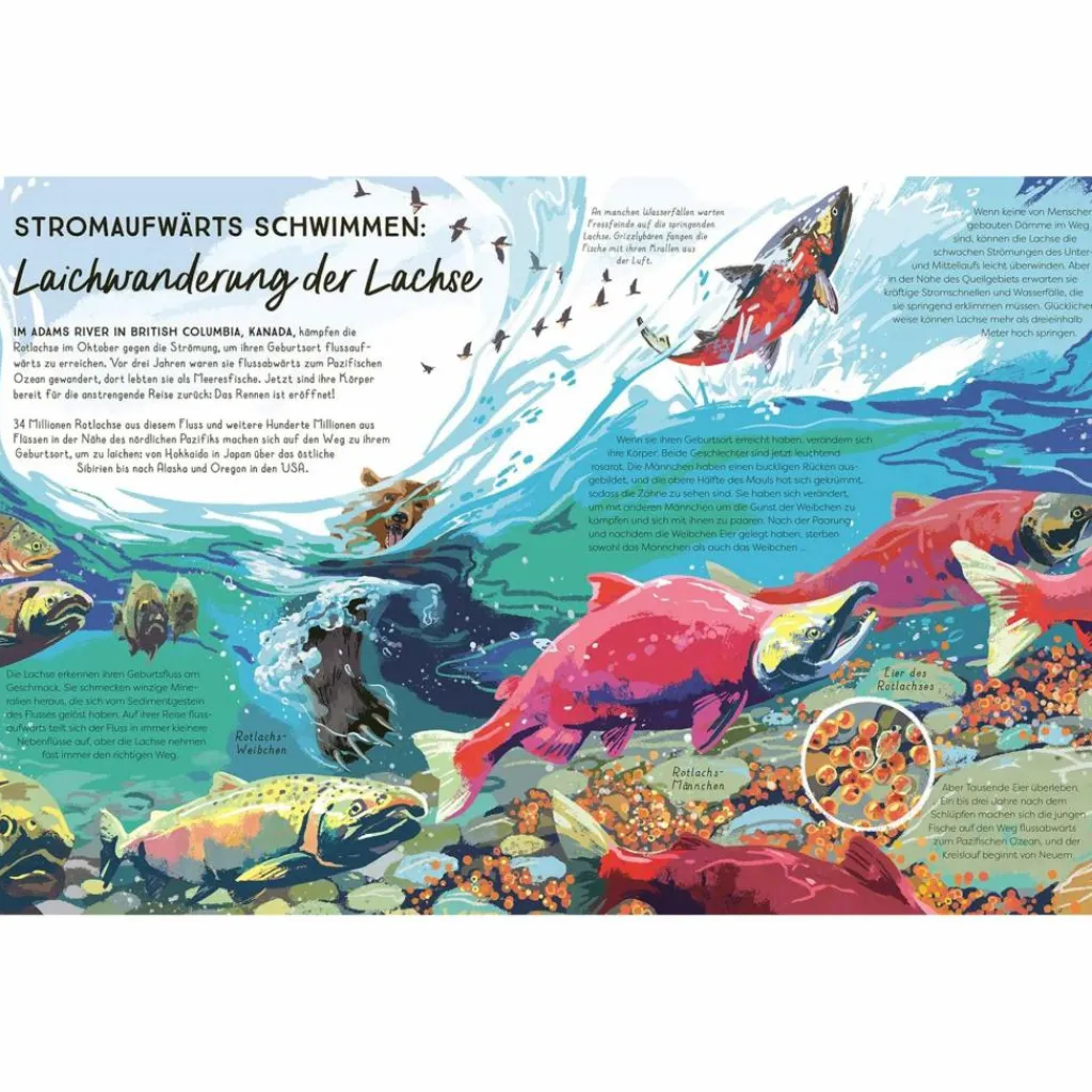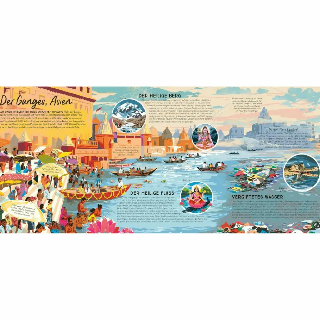 Zudem werden auf großformatigen Ausklappseiten die größten, bedeutsamsten und bekanntesten Wasserstraßen unserer sieben Kontinente vorgestellt. Komm mit zur Donau, zum Amazonas in Südamerika, an den Ganges, den Mississippi, zum Murray in Australien oder an die Ufer des Nils in Afrika. Ein üppig illustriertes Natursachbuch, vollgepackt mit wirklich allem, was es über Flüsse zu wissen gibt!