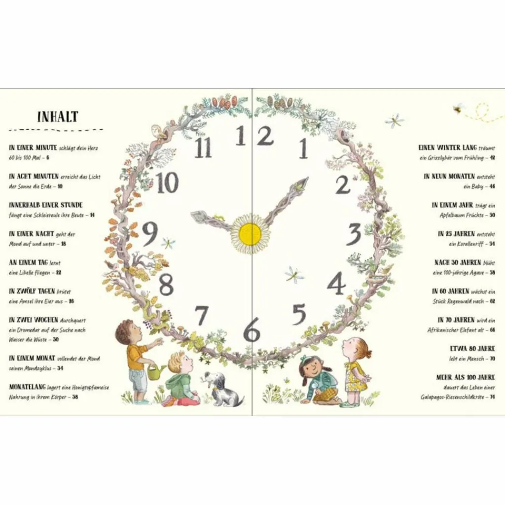 In acht Minuten erreicht das Licht der Sonne die Erde, an einem Tag lernt eine Libelle zu fliegen, in 25 Jahren entsteht ein Korallenriff und mehr als 100 Jahre lebt eine Galapagos-Riesenschildkröte. Von einer Minute bis zu einem Jahrhundert zeigt dieses zauberhaft illustrierte Buch in 18 kleinen Bildgeschichten, warum wir im Leben viel Geduld brauchen.