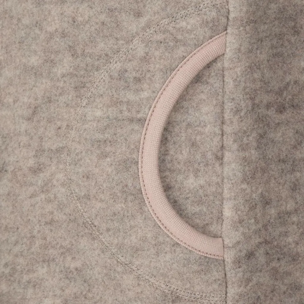 Der Wollfleece-Anzug ist aus reiner Bio-Merinowolle gefertigt, ist flauschig weich und hält angenehm warm. Merinowolle wirkt auf natürliche Weise feuchtigkeitsleitend und temperaturausgleichend. Dank dieser Eigenschaften sorgt das Material jederzeit für ein angenehmes Körperklima, egal ob die Kleinen gerade durch das Herbstlaub rennen oder sich entspannt von den Eltern durch die Natur tragen lassen. Zudem wärmt Wolle auch im feuchten Zustand, so braucht im Falle eines kleinen Nieselregens nicht gleich zur Regenbekleidung gewechselt zu werden. In den beiden Einschubtaschen können glänzende Kastanien und andere liebgewonnene Fundstücke zwischengelagert werden.