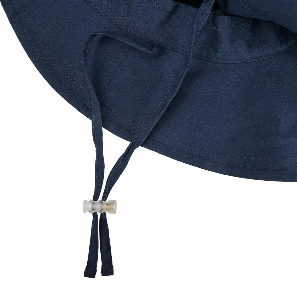 Der Sonnenhut besteht aus einem schnelltrocknenden Recycling-Material und hat einen angenehm weichen Griff. Da auf ein extra Innenmaterial verzichtet wurde, liegt er angenehm leicht auf dem Kopf. Dank des UV-Schutzes von 50+ können deine Kinder länger in der Sonne spielen. Die Krempe ist hinten etwas länger geschnitten und deckt dadurch den Nacken gut ab. Durch das verstellbare Kinnband können die Kleinsten den Hut nicht so schnell abnehmen – außerdem bleibt er so auch bei windigem Wetter sicher auf dem Kopf.