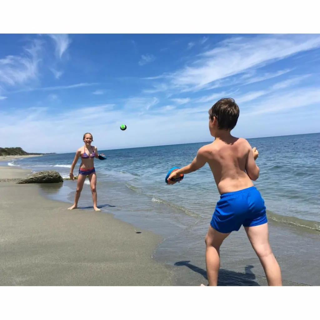 Das Spiel macht viel Freude und schult nebenbei die Koordination Auge-Hand sowie die Wurftechnik. Ein Riesenspaß für Jung und Alt. Das komplette Set ist in einer wiederverschließbaren Netztasche verpackt, in die man nach dem Spiel alles wieder einpacken kann. So findet sich der Ball auch beim nächsten Spiel wieder.