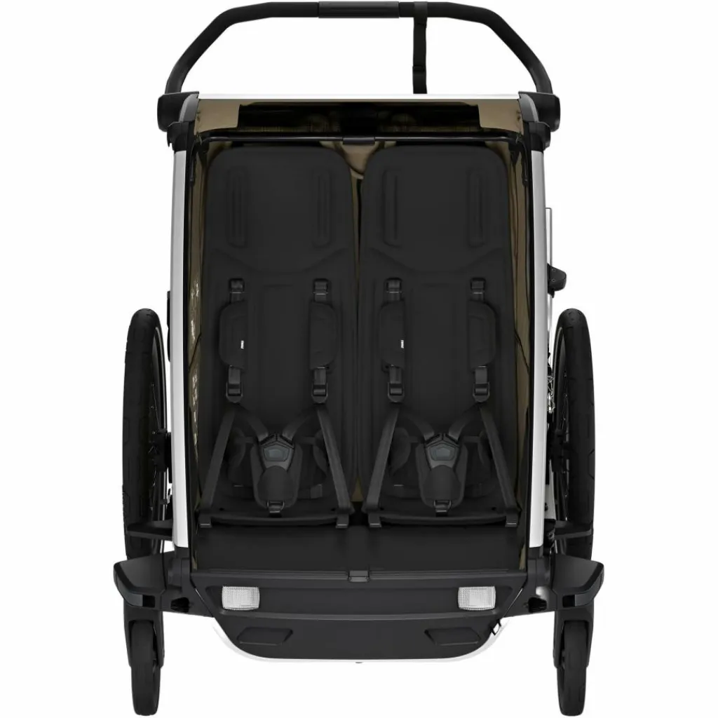 Der Chariot Cross 2 Double als Zweisitzer für aktive Familien bringt einige sinnvolle neue Details mit, die die Bedienfreundlichkeit erhöhen und es dir noch einfacher machen: Die verbesserte Deichsel sowie die beiden verbesserten Vorderräder etwa erlauben einen noch einfacheren Wechsel zwischen Anhänger- und Buggy-Funktion. Ebenfalls prima: Das helle Thule Delight Fahrradrücklicht, das mittig angebracht wird und auch abnehmbar ist. Und natürlich lässt sich der Anhänger weiterhin kompakt zusammenklappen, um ihn etwa im Auto zu transportieren. Ein rundum erstklassiger Anhänger für aktive Familien!