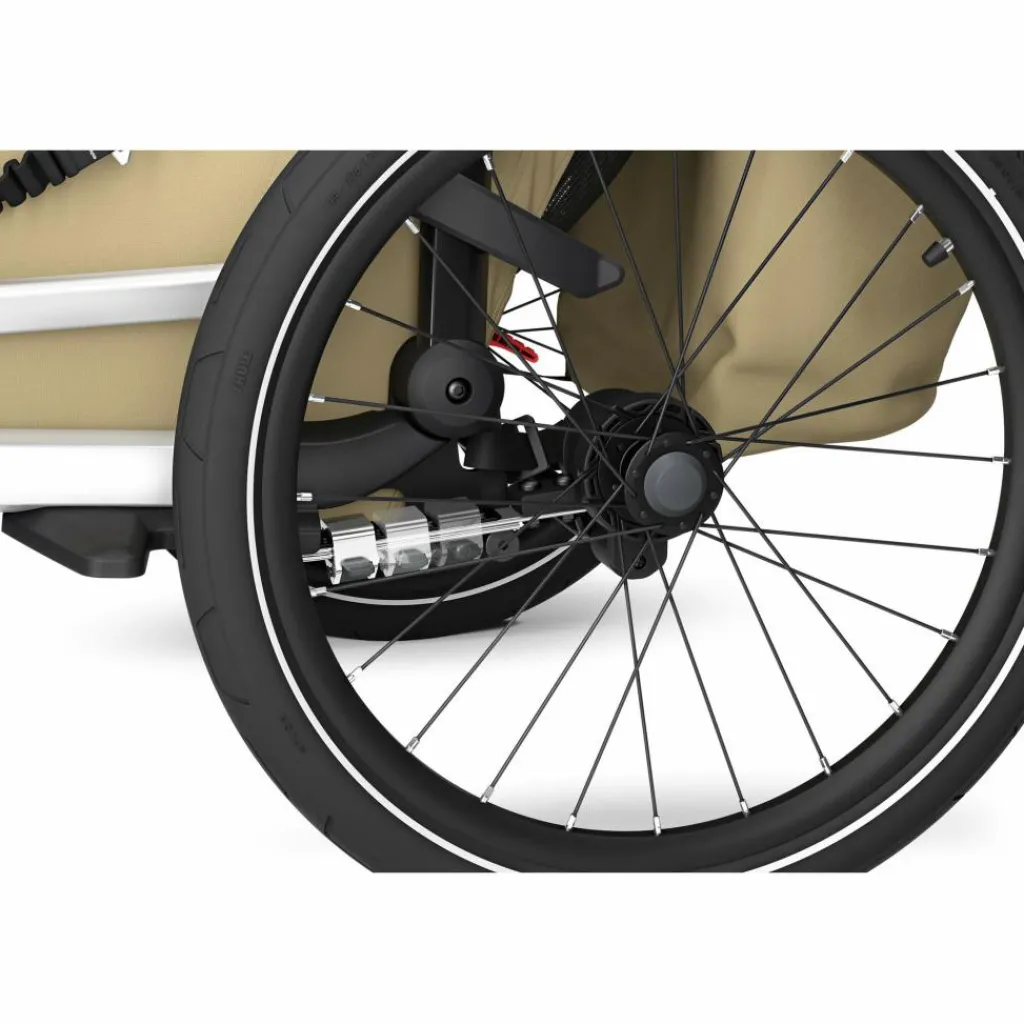 Die Räder, die dir den schnellen Wechsel vom Fahrradanhänger zum Buggy ermöglichen, sind jetzt schwenkbar konstruiert. Das Umstecken ist damit passé: Das jeweilige Rad muss nicht mehr komplett abgenommen werden. Einfach den Arretier-Hebel ziehen, das Rad um 180 Grad drehen und den Hebel wieder zurückdrücken. Fertig.