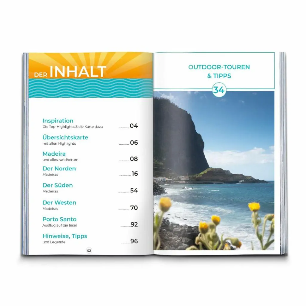 Besser vorher schon wissen, was es zu sehen gibt: Alle 34 Natur- und Wanderhighlights findest du im kompakten Reiseführer Inspiration Madeira. Wasserfälle, einsame Buchten, atemberaubende Aussichten oder einmalige Bergdörfer. Wer will solche Geheim-Tipps nicht schon vor der Reise erfahren? Perfekt für die Urlaubsplanung. So bekommt man schnell einen Überblick, wie man das Beste aus dem Urlaub oder Kurzurlaub macht. Dabei liegt der Fokus voll auf der Natur und einem Aktiv-Urlaub. Vorgestellt werden alle Ziele mit der dazu passenden Wandertour. Eingezeichnet in einer Karte, kompakt beschrieben und mit einem Foto ausgestattet bekommst du schnell einen schönen Eindruck was dich erwartet.