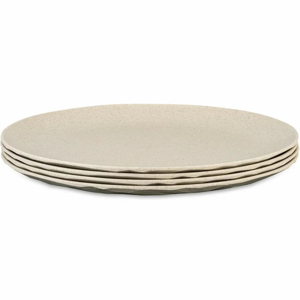 Dieses Set besteht aus vier Speisetellern mit je 26 cm Durchmesser. Hergestellt aus schwerem, bruchsicherem und biobasiertem Kunststoff in facettiertem Design.