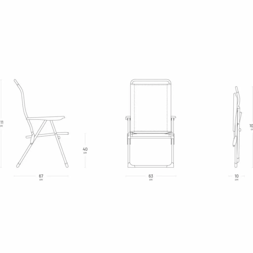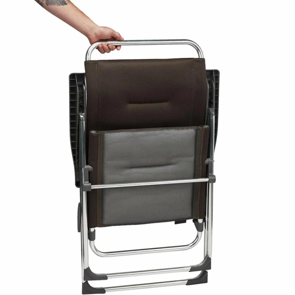 Den Stuhl klappst du lediglich auf – schon ist der Alu Cham Airco sitzbereit. Über den Handgriff verstellst du die Rückenlehne in fünf Positionen. Bequemes Sitzen am Tisch ist also ebenso möglich wie entspanntes Nach-hinten-lehnen und in den Himmel schauen. Für gesundes Sitzen sorgen die ergonomische Rückenlehne mit Lendenwirbelstütze und die ergonomisch geformten Armstützen. Die Füße des Alu Cham Airco gewähren dem Campingstuhl einen sicheren Stand. Sie sind weit aufgestellt und zum Schutz der Aluminiumrohre mit Kunststoff versehen. Verstärkte Nähte und das robuste Aluminiumgestell erlauben eine maximale Belastbarkeit bis 100 kg.