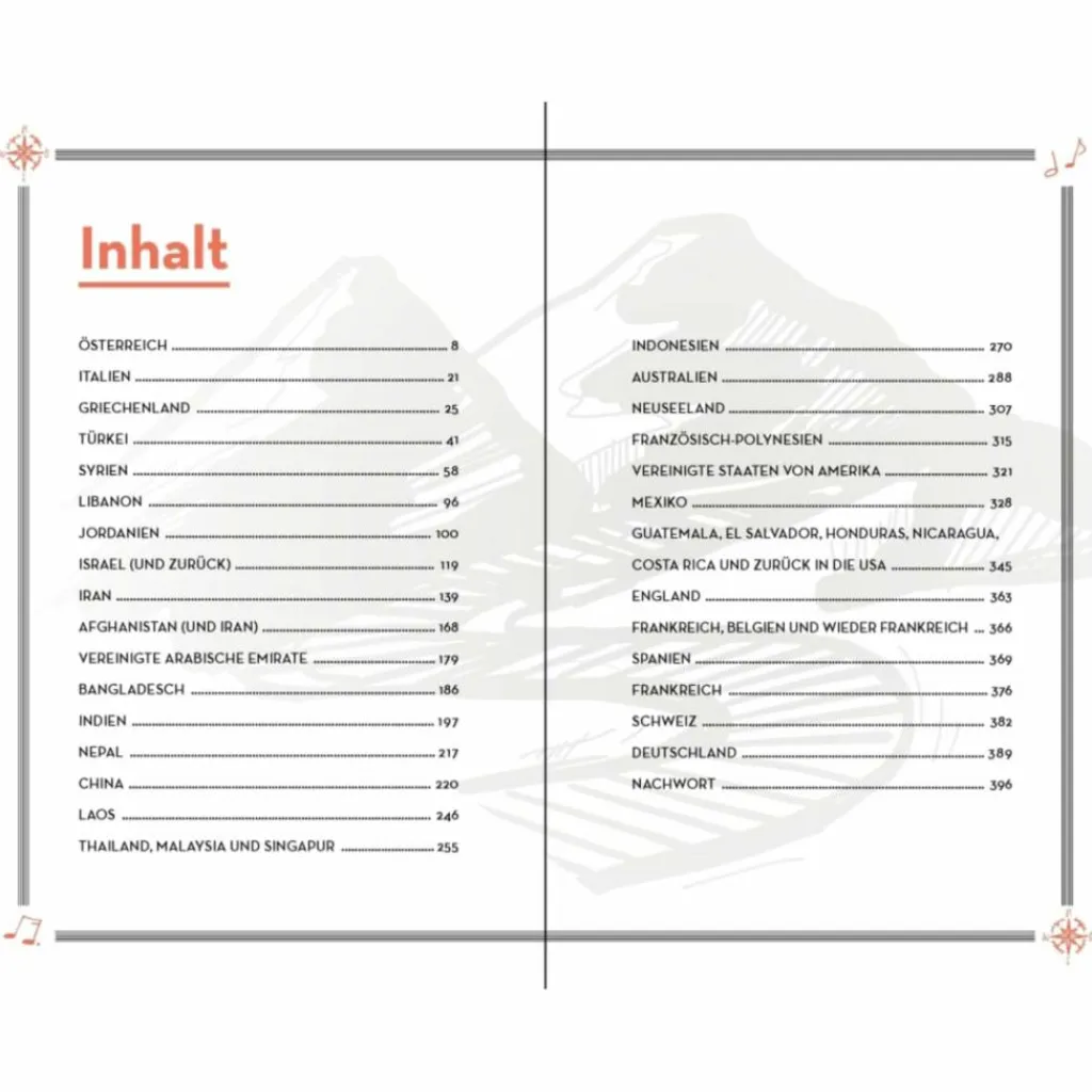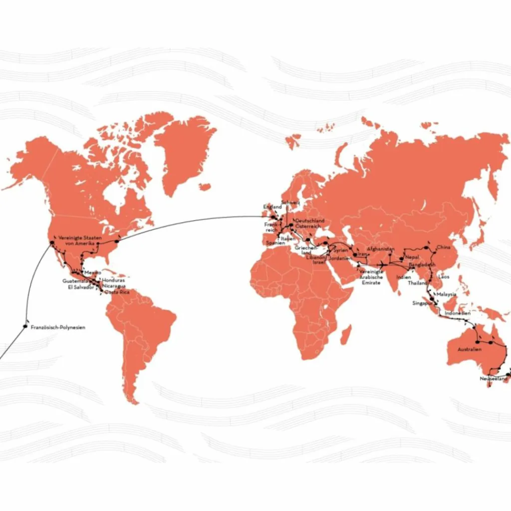 Über Österreich und Italien geht es nach Griechenland und weiter in die Türkei. Ab dort ist das Interesse der Menschen an Straßenmusik enorm, ebenso die Gastfreundschaft. Und die meiste Hilfsbereitschaft erfährt er dort, wo die Not am größten ist: in einem palästinensischen Flüchtlingsviertel in Damaskus. Über Afghanistan, Indien, Nepal und Tibet, China, Thailand, Malaysia und Indonesien erreicht Max mit einem Fischkutter Australien. In Neuseeland erspielt er sich sein Rückflugticket nach Europa, mit Zwischenstopps in Französisch-Polynesien und Nordamerika.