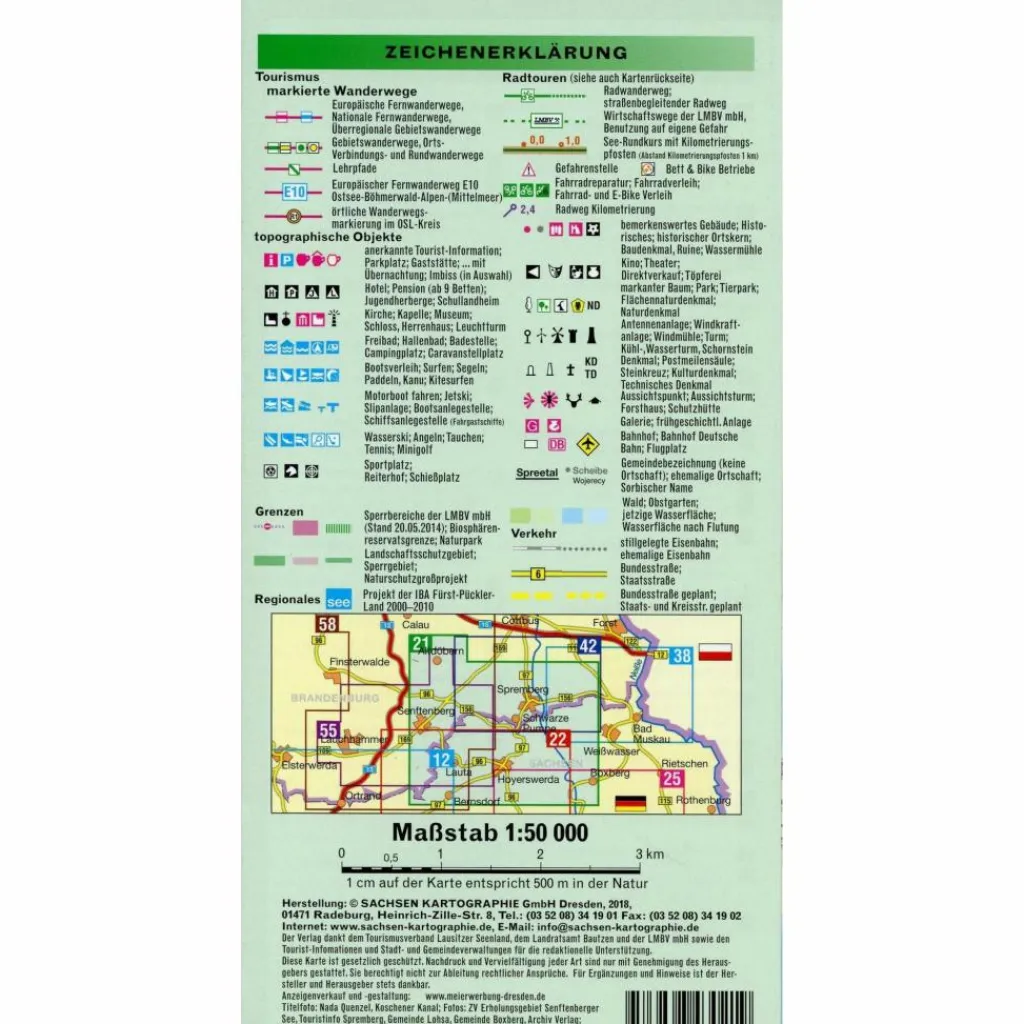 Umfasst das Gebiet des Lausitzer Seenlandes mit den Ortschaften Spremberg, Senftenberg, Hoyerswerda und Boxberg.Beinhaltet alle markierten Wanderwege als auch Radwege mit deren Kennzeichnung.Weiterhin sind die See-Rundkurse mit Kilometrierung besonders hervorgehoben.Die derzeitigen Sperrflächen sind gekennzeichnet. Ebenso sind der aktuelle und der zukünftige Wasserstand der zukünftigen Seen erkennbar.Durch die Darstellung der naturkundlichen, geologischen und historischen Informationen wird der Kartennutzer auf die großen und kleinen Sehenswürdigkeiten rechts und links des Weges aufmerksam gemacht.Auf der Kartenrückseite findet der Kartennutzer Informationen zu den einzelnen Seen und deren Sehenswürdigkeiten.