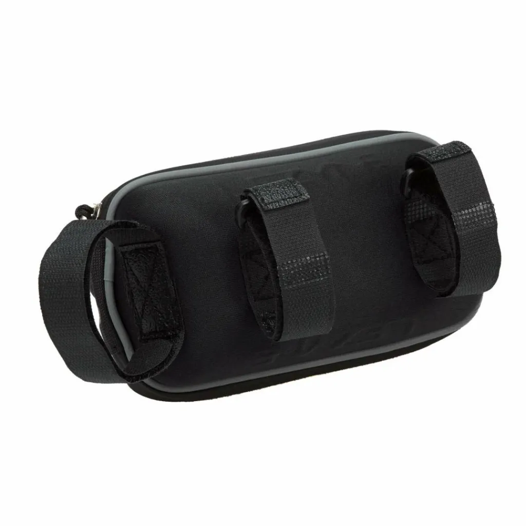 Die Tasche wird mit drei Klettverschlüssen am Rahmen befestigt. Die von unten gummierten Klettverschlüsse verhindern ein Verrutschen der Tasche am Oberrohr, ein Klettverschluss wird am Steuersatz befestigt und sorgt dafür, dass die Tasche nicht nach unten kippt. Ein wasserdichter Reißverschluss schützt den Inhalt zudem zuverlässig vor Spritzwasser.