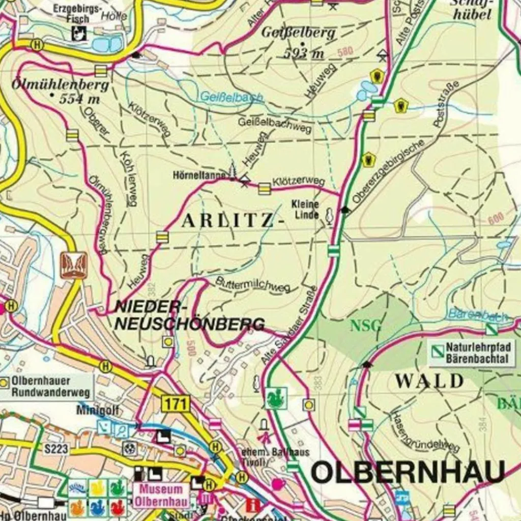 Beinhaltet alle markierten Wanderwege als auch Radwege mit deren Kennzeichnung, wie der Kammwanderweg, die Reiterlein-Radwege um Olbernhau, die Bergbaulehrpfade um Annaberg-BuchholzWeiterhin sind die bekannten Mountainbikestrecken Stoneman Miriquidi, Seiffen Tour und der EBM (Erzgebirge-Bike-Marathon) eingetragen.Durch die Darstellung der naturkundlichen, geologischen und historischen Informationen wird der Kartennutzer auf die großen und kleinen Sehenswürdigkeiten rechts und links des Weges aufmerksam gemacht.