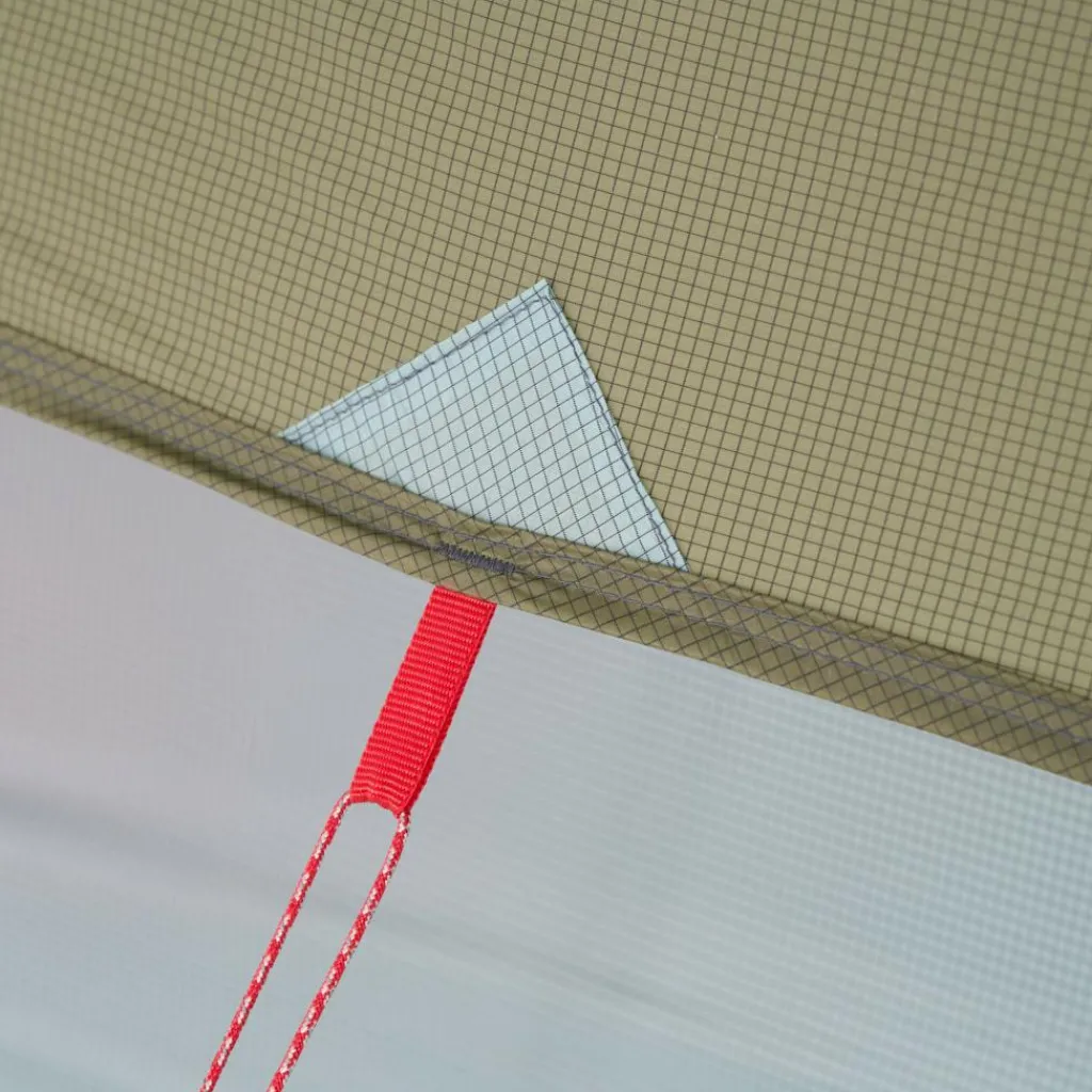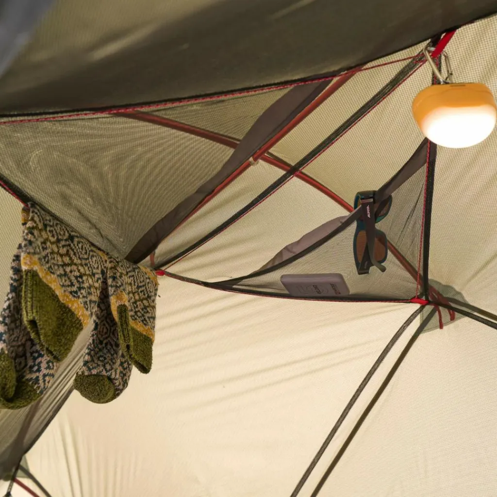 Im Innenraum stehen dir vier Schlaufen zur Verfügung, etwa zum Aufhängen einer Zeltlaterne oder zum Spannen einer Wäscheleine im Deckenbereich. Ergänzt wird das Stauraumangebot durch mehrere Netztaschen. Zwei kleinere befinden sich im Deckenbereich, zwei größere im Kopf- und Fußbereich. So bringst du Kleinteile übersichtlich unter.