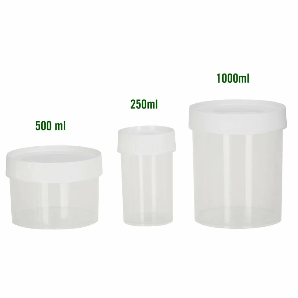 Durchsichtige Vorratsdose mit wasserdichtem Schraubverschluss. Hergestellt aus Polypropylen und geeignet zum Verstauen von Lebensmitteln aller Art.