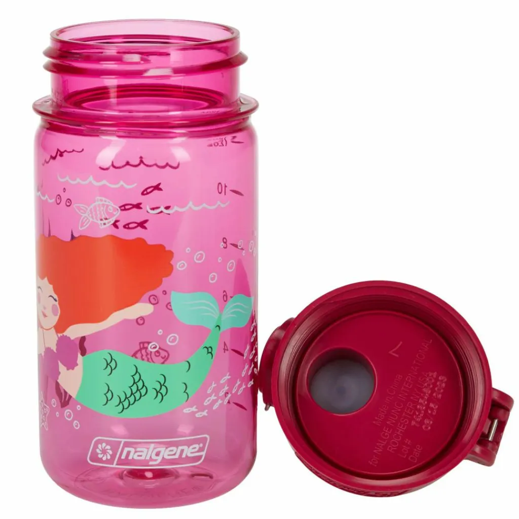 Der Verschluss der OTF ist auslaufsicher und kann mit einem kleinen Drahtbügel gesichert werden. Wird dieser nach unten geklappt, genügt ein leichter Druck auf das Nalgene-Logo, um den Deckel zu öffnen. Am Henkel kannst du die Kinderflasche bequem tragen oder am Rucksack mit einem Karabiner sichern.