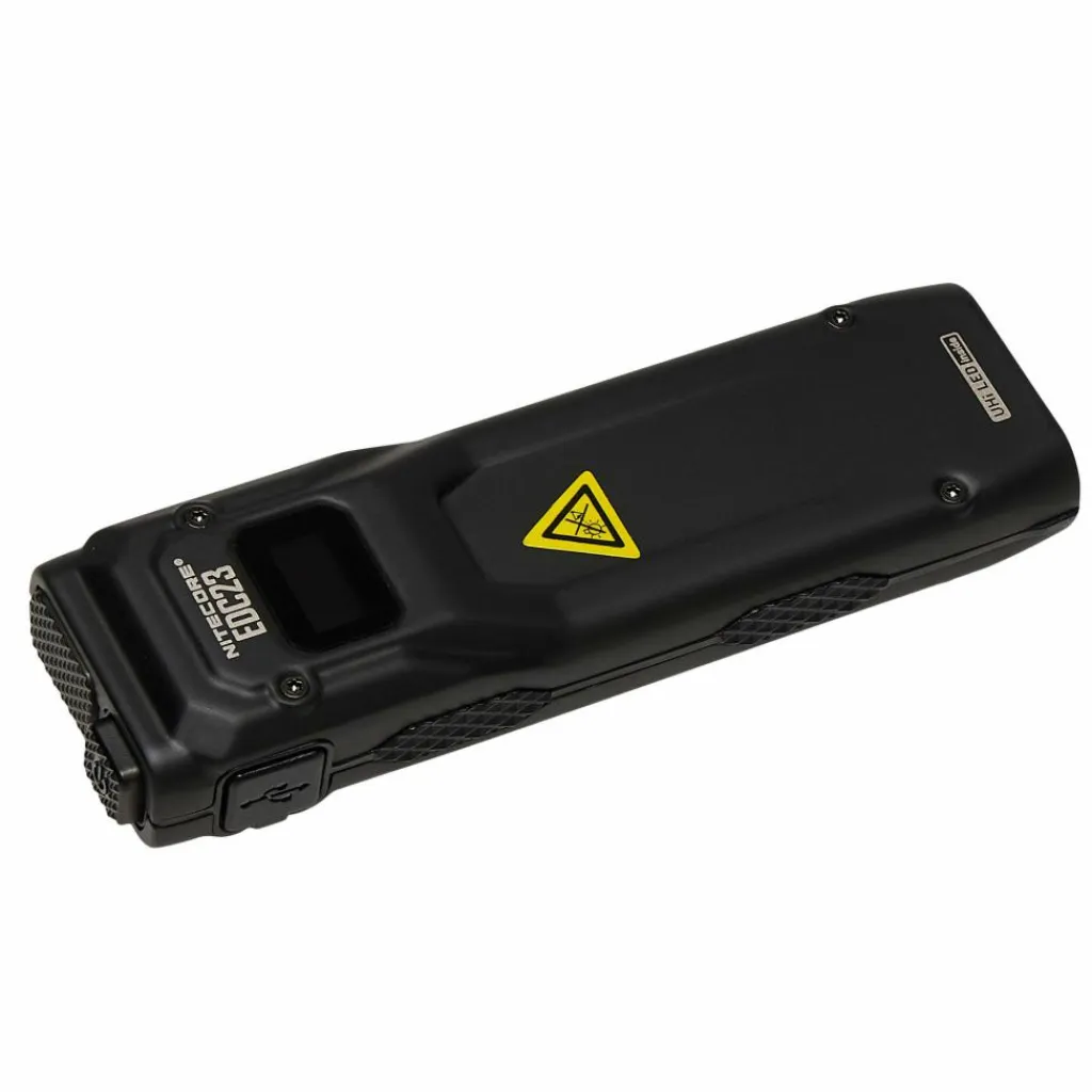 Zwei Hochleistungs-LEDs erzeugen ein starkes, fokussiertes Lichtbild. Die fünf Helligkeitsstufen lassen sich über den Haupt- und Modus-Schalter intuitiv bedienen. Für zusätzliche Sicherheit sorgen ein Lock-Out-Modus sowie ein Näherungssensor, der eine Überhitzung bei nahen Objekten verhindert. Über das seitlich angebrachte OLED-Display kannst du Leuchtstufe, Akkustand und Restlaufzeit bequem ablesen.