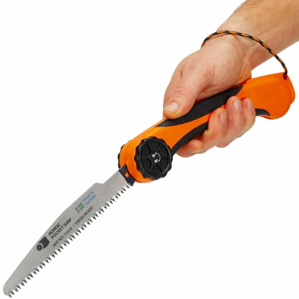 Die Fold Säge ist mit einem Frischholzsägeblatt ausgestattet, das sich zum Beschneiden von Bäumen oder zum Kleinsägen von Feuerholz eignet. Das eingesetzte Sägeblatt kann gegen handelsübliche Säbelsägeblätter (S-Schaft-System) ausgetauscht werden. So kannst du bei Bedarf auch Metall, Kunststoff, Stein oder Hartholz sägen.