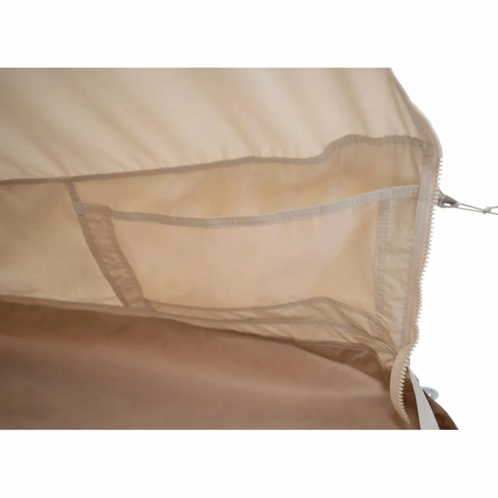Ein fest eingenähter Zeltboden hält Wasser und Schmutz draußen und kann nach der Benutzung leicht mit einem Schwamm gereinigt werden. Im Zelt befinden sich zwei Seitentaschen zum Verstauen von Kleinigkeiten und ein mit einem Moskitonetz versehenes Fenster.