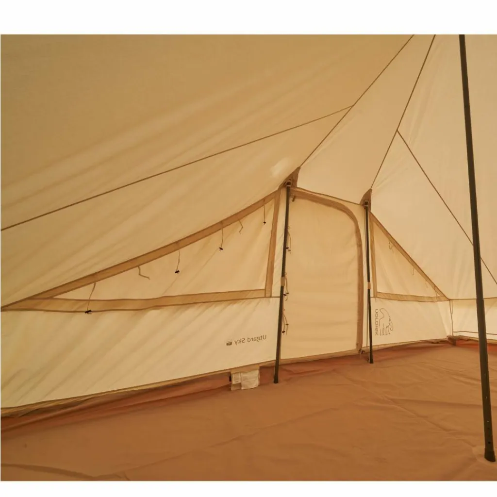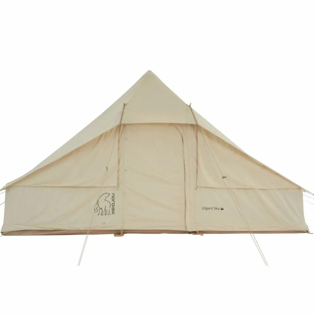 Das Utgard Sky wird mit 5 Stahlstangen aufgebaut, von der eine die Mittelstange bildet. Dank der quadratischen Grundfläche lässt sich der Innenraum unkompliziert einrichten und bietet 6 schlafenden Personen bequem Platz. So finden auch ein kleiner Campingtisch mit kompakten Stühlen darin Platz, genau wie Decken, Teppiche oder Laternen – alles, was du zum Verwirklichen deines Glamping-Traums brauchst. Beim Material sowie bei der Verarbeitung der Befestigungspunkte überzeugt das Zelt mit hochwertiger Qualität und viel Stabilität.