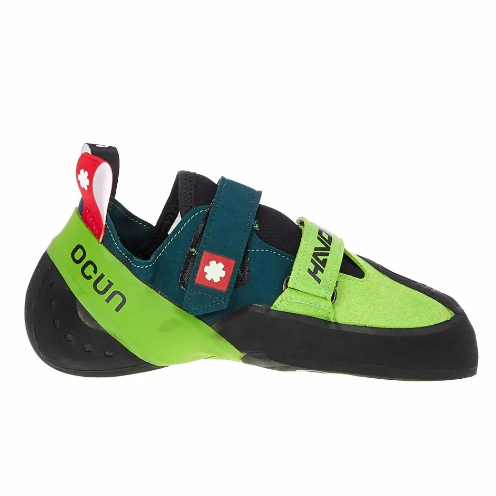 Sein weiches Obermaterial mit elastischer Zunge schmiegt sich eng um deinen Fuß. Mit den beiden gegenläufigen Klettriemen kannst du den Schuh optimal anpassen. Außensohle und Zehenpatch bestehen aus Ocúns CAT Rubber 1.5, einer klebrigen Gummimische für maximale Reibung.