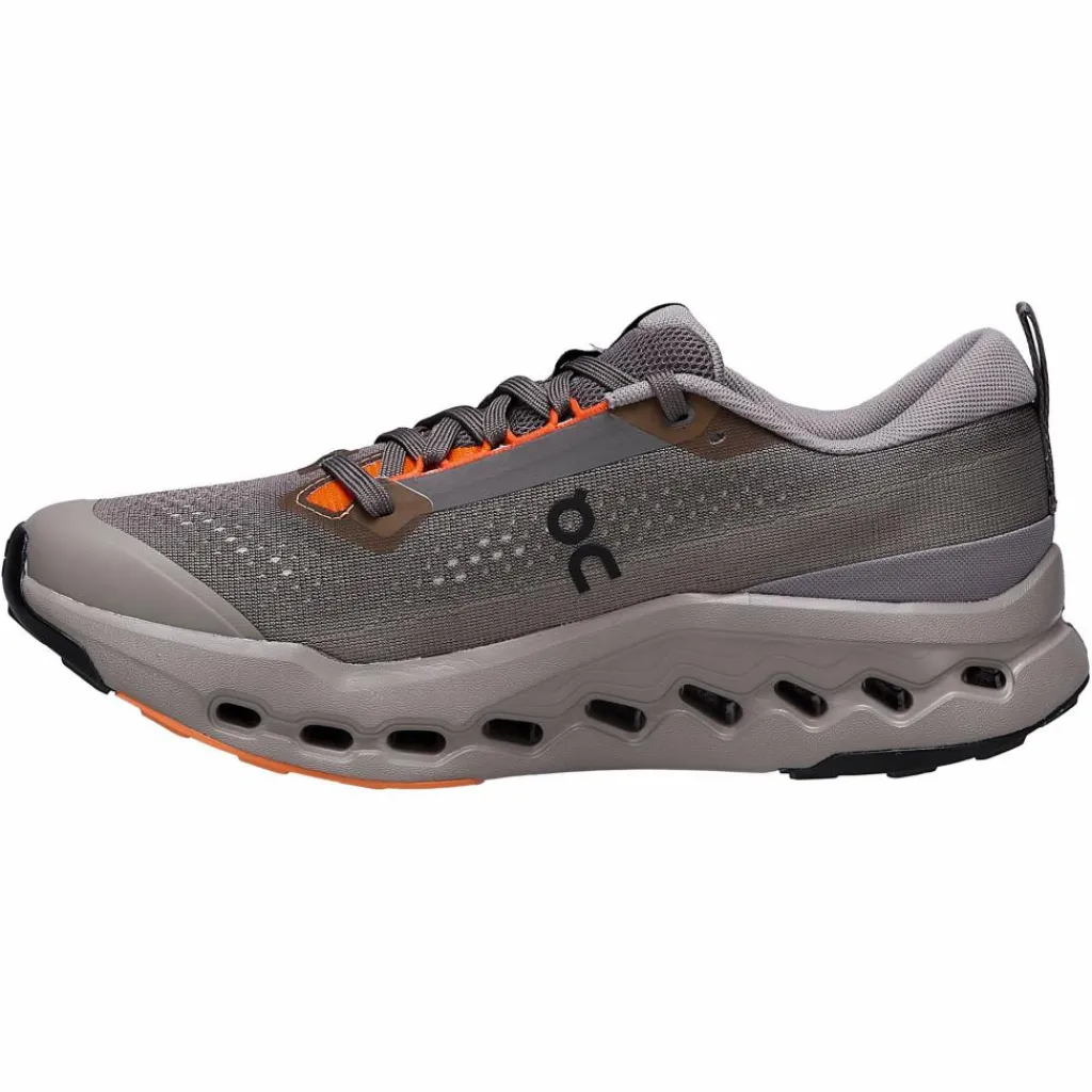 Auffallend ist beim Cloudsurfer Trail vor allem die Anordnung der Cloud-Dämpfungselemente. Im Zehen- und Ballenbereich sind sie horizontal angeordnet, im Mittelfußbereich kippen sie leicht nach hinten, wodurch zum einen der Vortrieb verbessert, vor allem aber die Abrollbewegung des Fußes auch bei hohem Tempo optimal unterstützt wird. Die Laufsohle ist mit griffigem Profil ausgestattet, dass up- und downhill für bestmöglichen Halt sorgt. Dank der moderaten Profiltiefe kannst du den Trailrunningschuh auch auf härteren Untergründen noch gut nutzen.