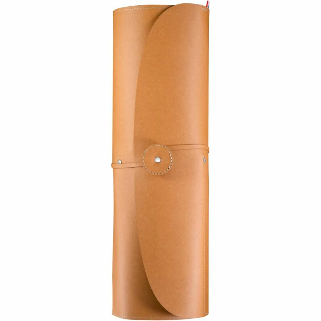 Einmal eingesteckt, lässt sich das Etui platzsparend zusammenrollen. Die Griffe der Messer werden dabei durch Filzlappen geschützt.