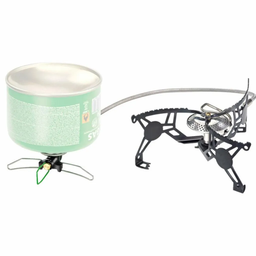 Die Vorteile: Sehr niedrige Bauhöhe, hohe Stabilität, Flüssiggaszufuhr bei niedrigen Temperaturen. Die umgedrehte Aufstellung der Kartusche ermöglicht das Kochen bei Minusgraden.