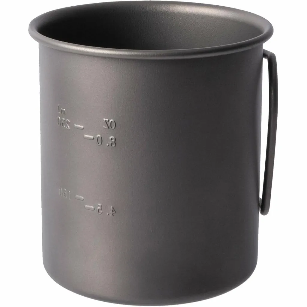 Die Volumenmarkierung auf der Innenseite hilft dir dabei, die richtige Menge Wasser für die Trekkingnahrung abzumessen. Für die Zubereitung kannst du den Becher direkt auf deinen Kocher stellen. Aber Achtung: Der Griff kann heiß werden und das Material kann sich verfärben. Die Funktion wird dadurch jedoch nicht beeinträchtigt.