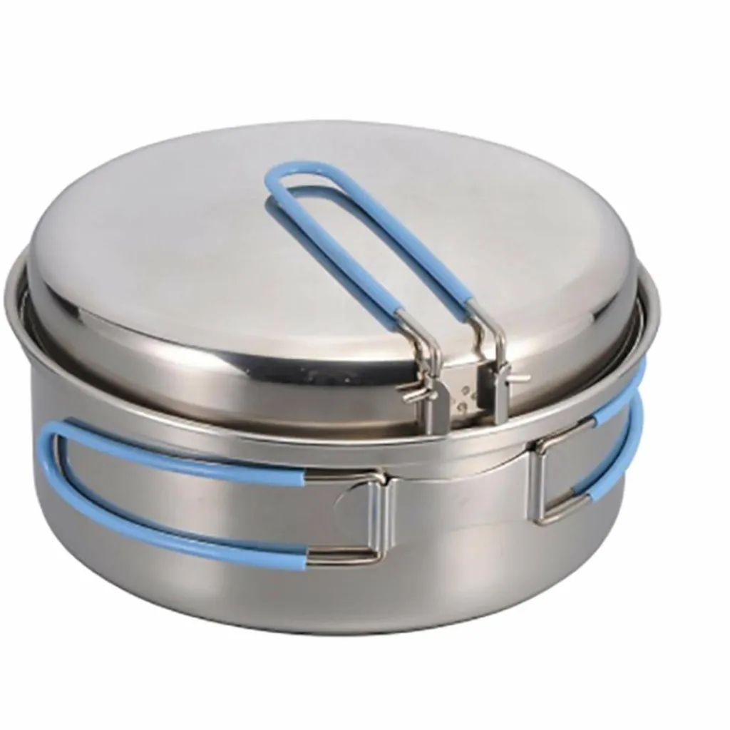 Edelstahlkochset für zwei Personen, das neben einem 1,5 l Topf auch eine Pfanne und zwei Teller enthält. Alle Teile können platzsparend ineinander gestapelt werden. Die Griffe sind klappbar.