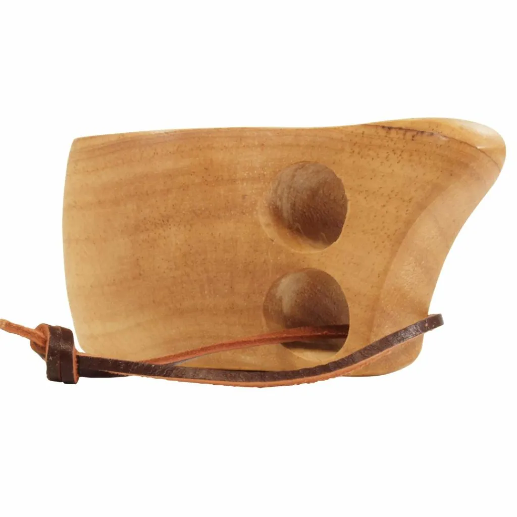 Finnische Holztasse mit klassischem Zwei-Finger-Henkel und Lederkordel zum Aufhängen. Aus der Kuksa lässt sich hervorragend Tee, Kaffee aber auch kräftigere Getränke genießen.