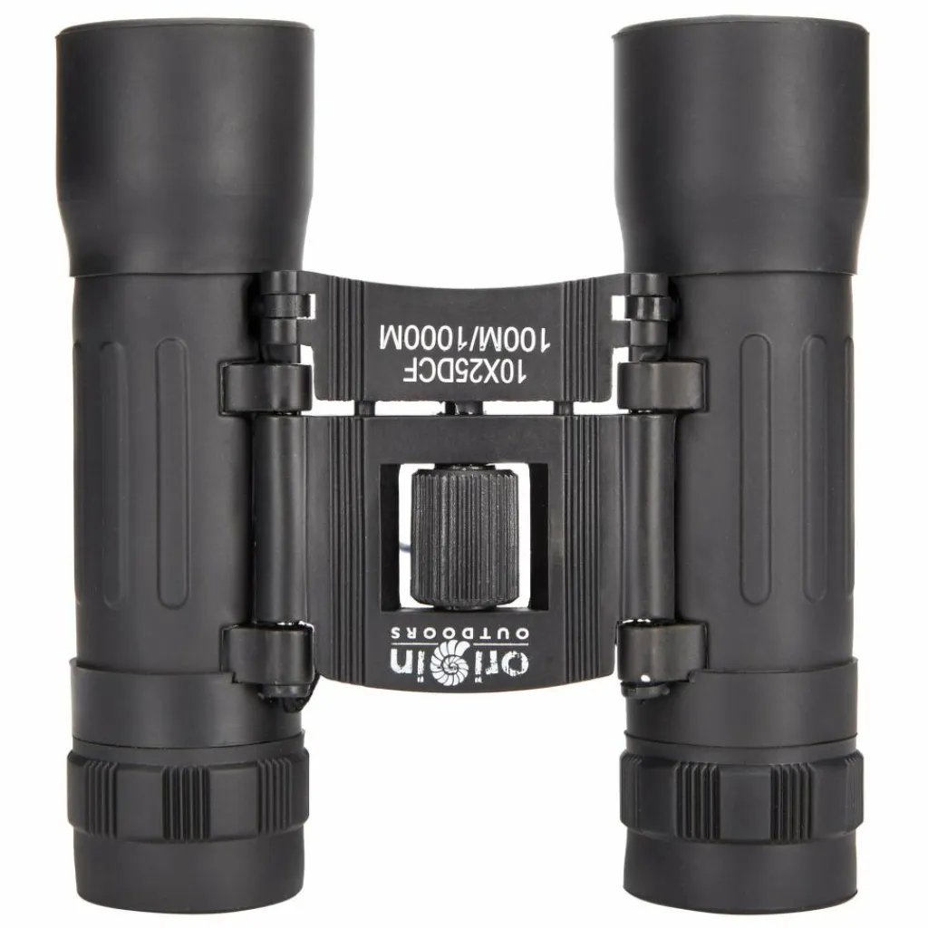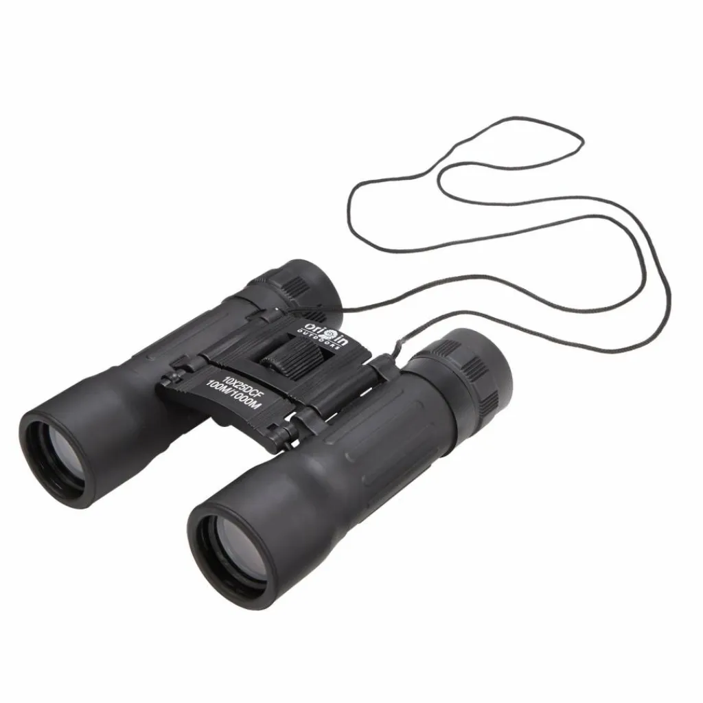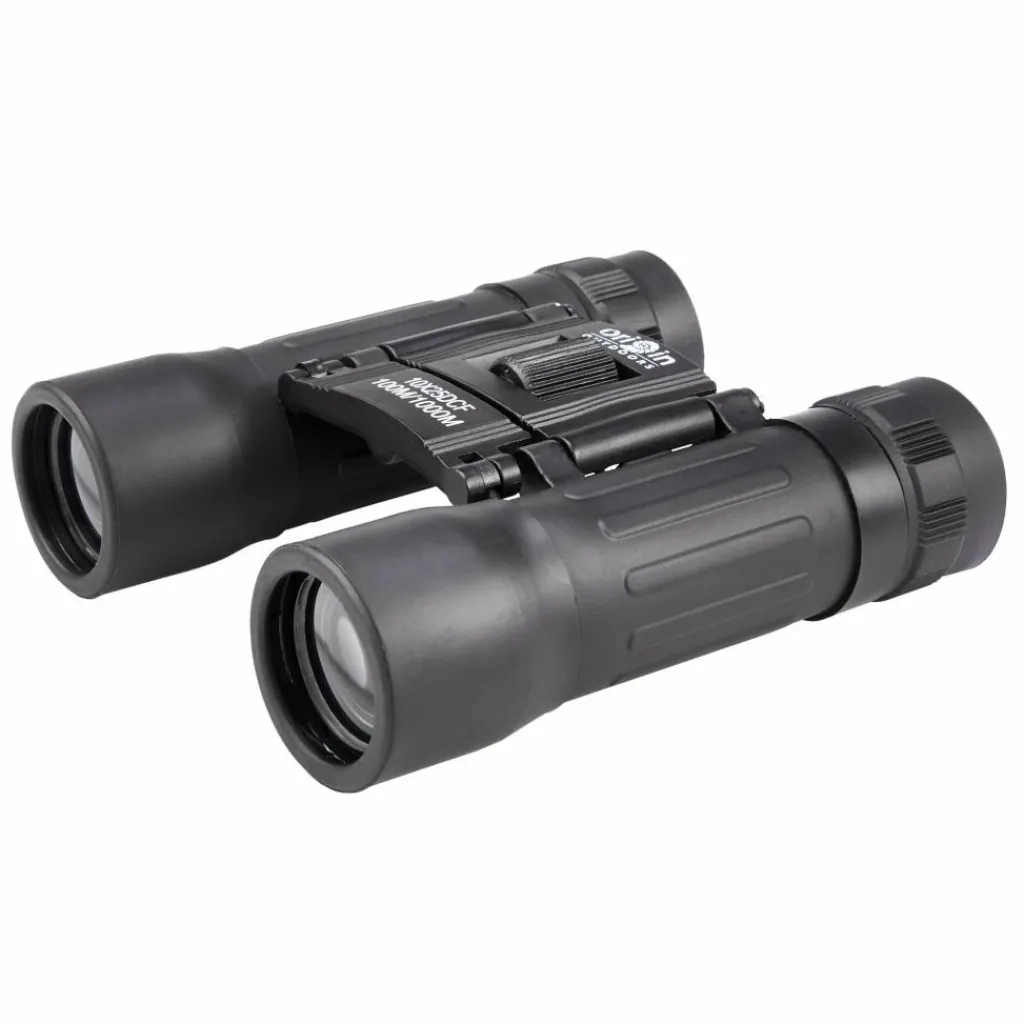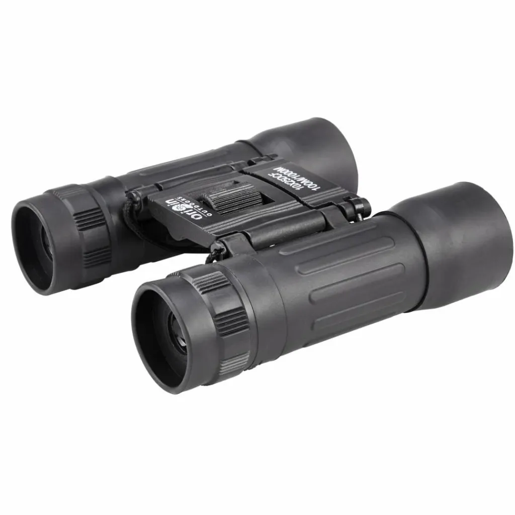 Fernglas für Einsteiger mit 10-facher oder 12-facher Vergrößerung, kompaktem Faltmaß und Sehstärkenregulierung. Im Lieferumfang inbegriffen sind ein Gürteletui, Umhängeband und ein Reinigungstuch.