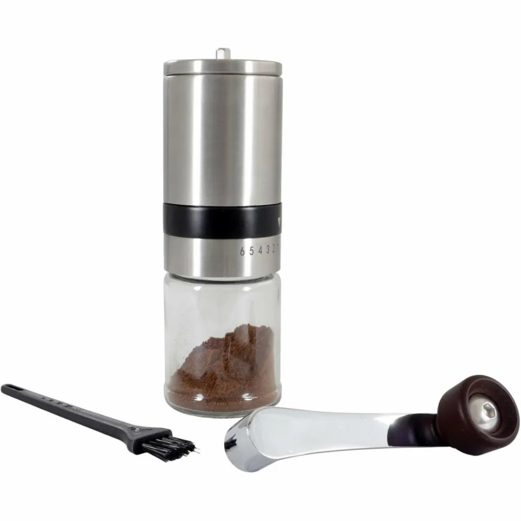 Diese Kaffeemühle mit abnehmbarer Kurbel ist perfekt für Reisen mit kleinem Gepäck geeignet. Der Mahlgrad ist in sechs Stufen einstellbar. Ausgestattet ist sie mit einem Keramikmahlwerk.