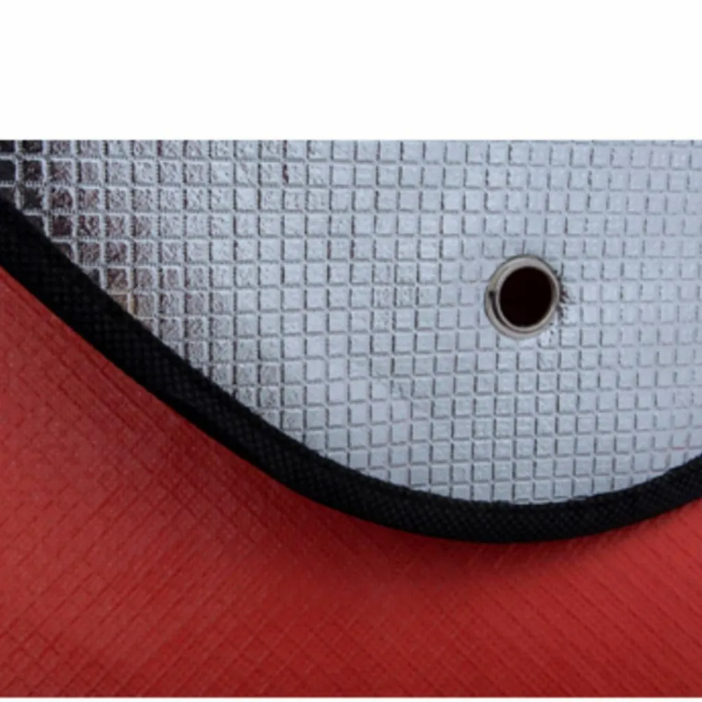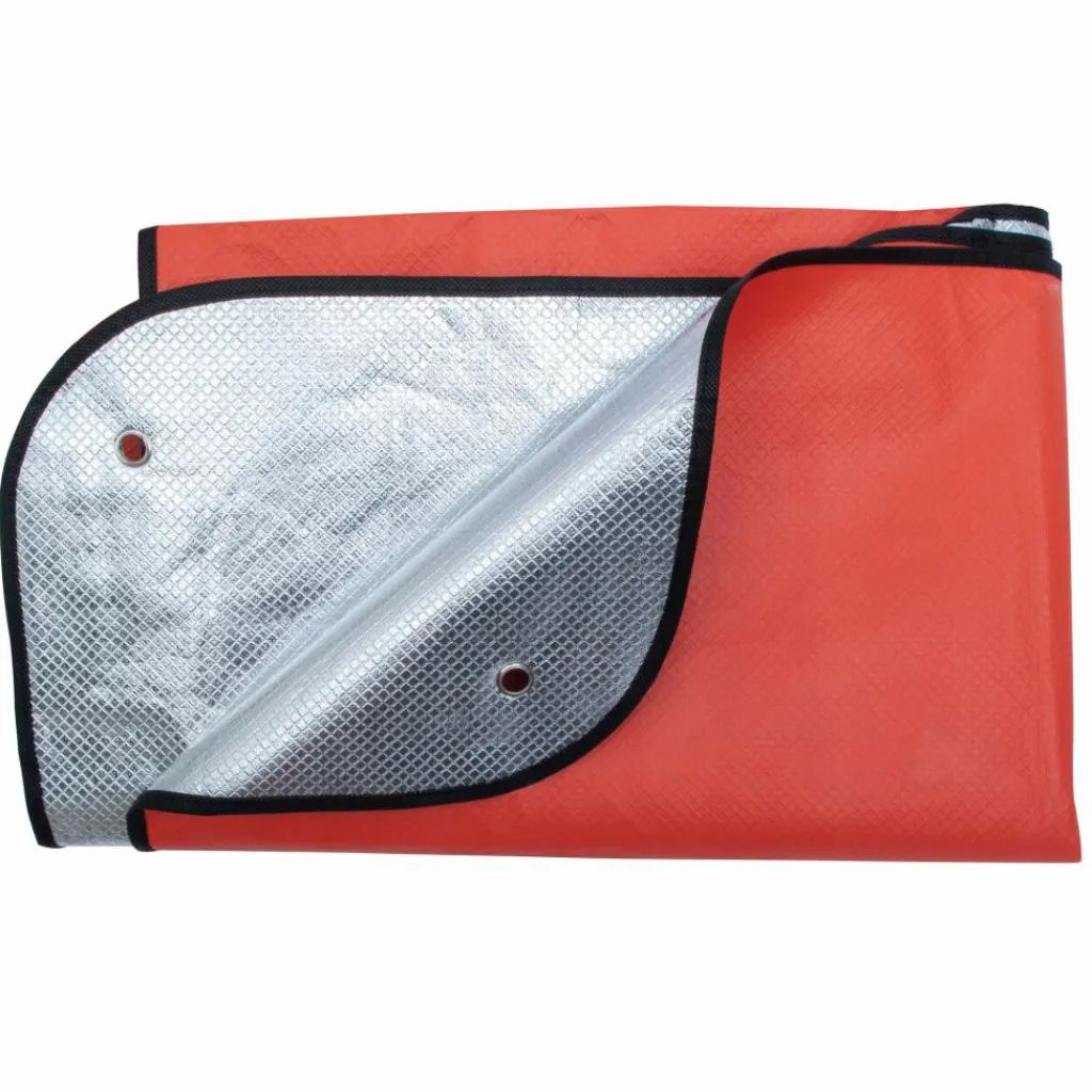 Rettungsdecke aus Verbundmaterial. Die hochwertige Alubeschichtung erreicht eine 90 %ige Wärmerückstrahlung. An den Kanten ist die Unterlage eingesäumt, die Ecken sind verstärkt und mit Ösen versehen.