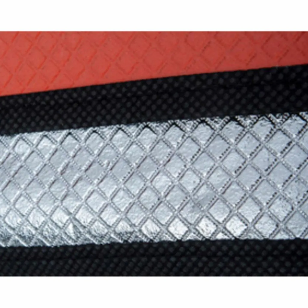 Gewebenetz aus 100 % Polyester mit metallisierter Beschichtung, auf der Rückseite mit PE-Beschichtung.