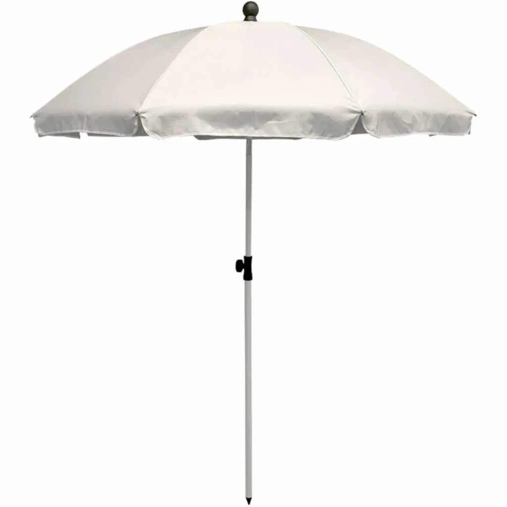 Einfacher Sonnenschirm mit 180 cm Durchmesser. Die Bespannung aus Polyester ist mit einer Silberbeschichtung versehen und erreicht damit einen Sonnenschutzfaktor von UPF 50+.