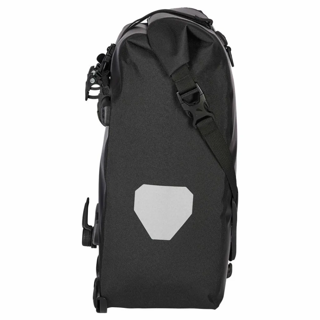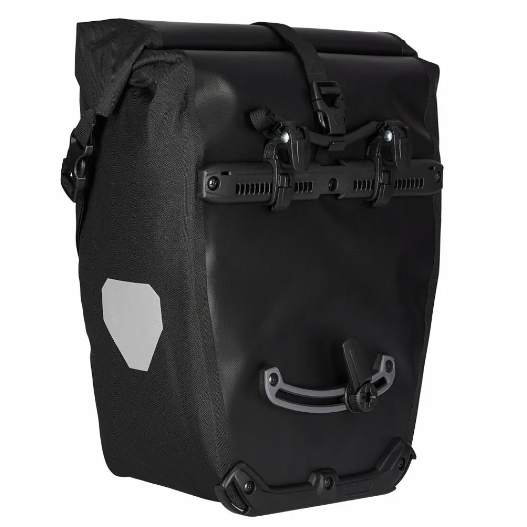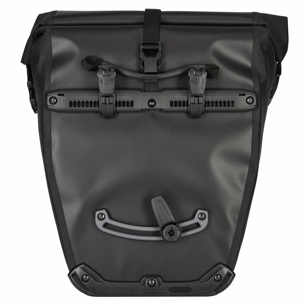 Aufhängung für Gepäckträger mit einem Rohrdurchmesser von 8 bis 16 mm. Beim QL2.1-System wurde die Schiene mit den Befestigungshaken an der Taschenrückseite überarbeitet. Die beiden oberen Haken lassen sich werkzeugfrei auf der nun aus einem Stück gefertigten Schiene verschieben und durch Anheben des Tragegriffs öffnen. Der untere Arretierungshaken ist ebenfalls auf einer halbelliptischen Schiene individuell anpassbar und werkzeugfrei in 15°-Schritten drehbar. Ein Scheuerschutz im unteren Bereich der Taschen und an der Auflagefläche des Gepäckträgers beugt Abrieb vor.