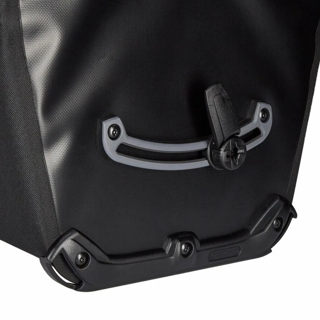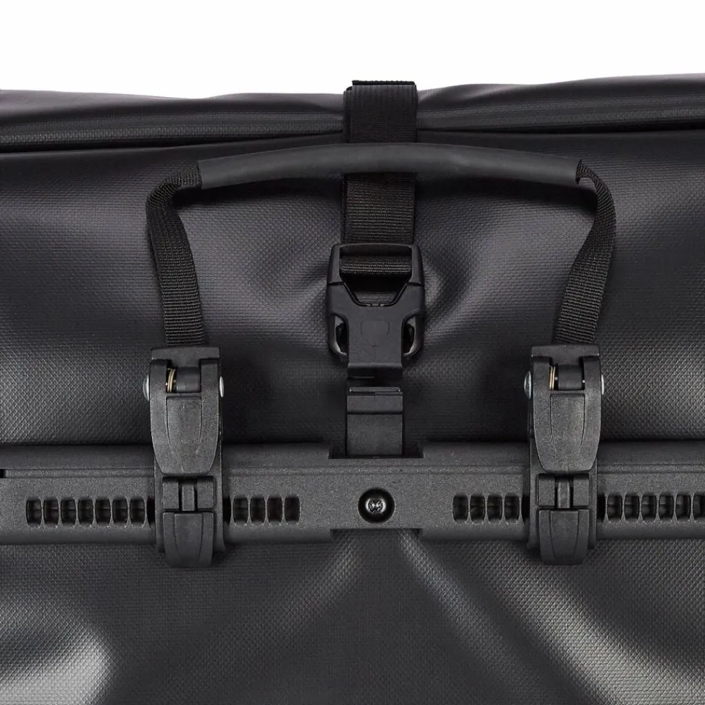 Aufhängung für Gepäckträger mit einem Rohrdurchmesser von 8 bis 16 mm. Die beiden oberen Haken lassen sich werkzeugfrei auf der aus einem Stück gefertigten Schiene verschieben und durch Anheben des Tragegriffs öffnen. Der untere Arretierungshaken auf einer halbelliptischen Schiene ist ebenfalls individuell anpassbar und werkzeugfrei in 15-Grad-Schritten drehbar. Ein Scheuerschutz im unteren Bereich der Taschen und an der Auflagefläche des Gepäckträgers beugt Abrieb vor.