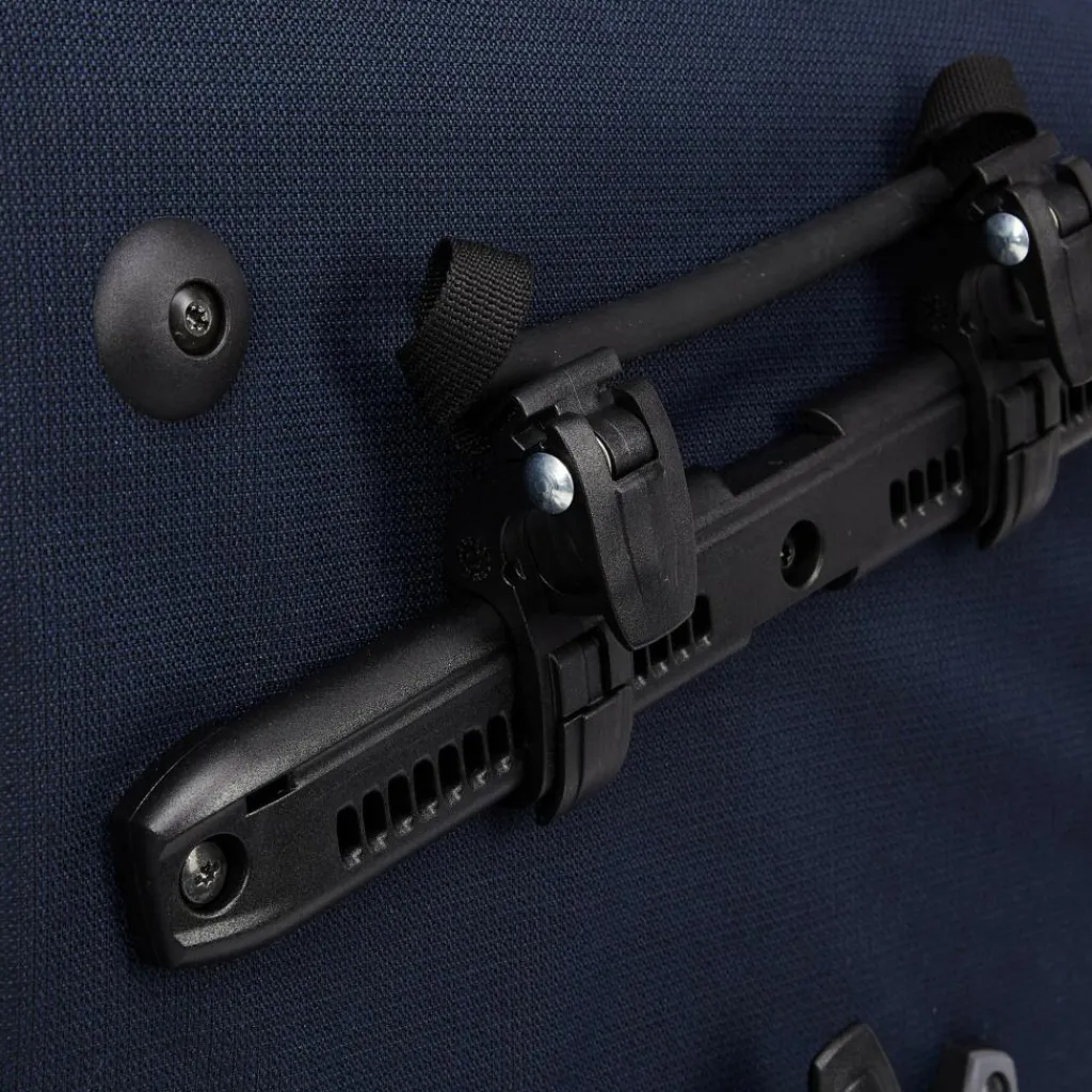 Aufhängung für Gepäckträger mit einem Rohrdurchmesser von 8 bis 16 mm. Beim QL2.1-System wurde die Schiene mit den Befestigungshaken an der Taschenrückseite überarbeitet. Die beiden oberen Haken lassen sich werkzeugfrei auf der nun aus einem Stück gefertigten Schiene verschieben und durch Anheben des Tragegriffs öffnen. Der untere Arretierungshaken ist ebenfalls auf einer halbelliptischen Schiene individuell anpassbar und werkzeugfrei in 15°-Schritten drehbar. Ein Scheuerschutz im unteren Bereich der Taschen und an der Auflagefläche des Gepäckträgers beugt Abrieb vor.