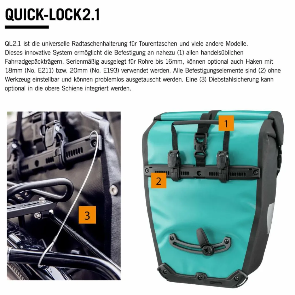 Aufhängung für Gepäckträger mit einem Rohrdurchmesser von 8 bis 16 mm. Die beiden oberen Haken lassen sich werkzeugfrei auf der aus einem Stück gefertigten Schiene verschieben und durch Anheben des Tragegriffs öffnen. Der untere Arretierungshaken ist ebenfalls auf einer halbelliptischen Schiene individuell anpassbar und werkzeugfrei in 15-Grad-Schritten drehbar. Ein Scheuerschutz im unteren Bereich der Taschen und an der Auflagefläche des Gepäckträgers beugt Abrieb vor.