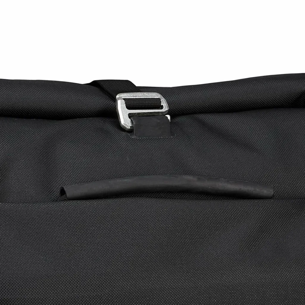 Aufhängung für Gepäckträger mit einem Rohrdurchmesser von 8 bis 16 mm. Die beiden oberen Haken lassen sich werkzeugfrei auf der aus einem Stück gefertigten Schiene verschieben und durch Anheben des Tragegriffs öffnen. Der untere Arretierungshaken ist ebenfalls auf einer halbelliptischen Schiene individuell anpassbar und werkzeugfrei in 15-Grad-Schritten drehbar. Ein Scheuerschutz im unteren Bereich der Taschen und an der Auflagefläche des Gepäckträgers beugt Abrieb vor.