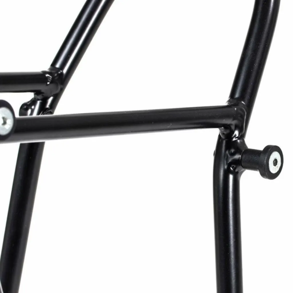 Der Gepäckträger wird mit vier Befestigungspunkten am Fahrradrahmen befestigt und bildet so eine kompakte, stabile und sichere Einheit für lange Radreisen. Die QL3-Aufhängepunkte sind tief angebracht, um das Gewicht nahe an die Achse zu bringen und den Schwerpunkt niedrig zu halten; das garantiert eine ruhige Fahrt. Die tief angebrachte Strebe erfüllt den gleichen Zweck für ältere QuickLock-Systeme.