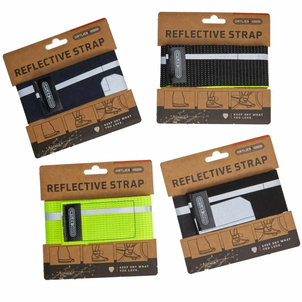 Reflektierendes Klettband, das deine Hose vor Schmutz schützt und dich im Straßenverkehr besser sichtbar macht. Der Reflective Strap wird aus Geweberesten hergestellt, die bei Ortlieb anfallen.