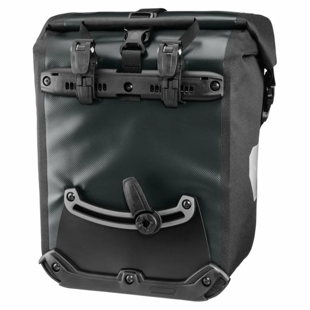 Aufhängung für Gepäckträger mit einem Rohrdurchmesser von 8 bis 16 mm. Beim QL2.1-System wurde die Schiene mit den Befestigungshaken an der Taschenrückseite überarbeitet. Die beiden oberen Haken lassen sich werkzeugfrei auf der nun aus einem Stück gefertigten Schiene verschieben und durch Anheben des Tragegriffs öffnen. Der untere Arretierungshaken ist ebenfalls auf einer halbelliptischen Schiene individuell anpassbar und werkzeugfrei in 15°-Schritten drehbar. Ein Scheuerschutz im unteren Bereich der Taschen und an der Auflagefläche des Gepäckträgers beugt Abrieb vor.
