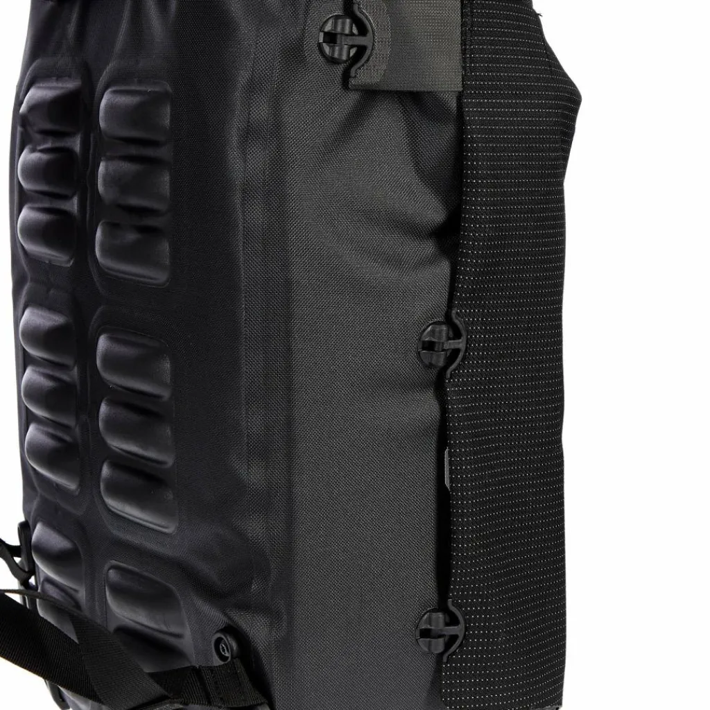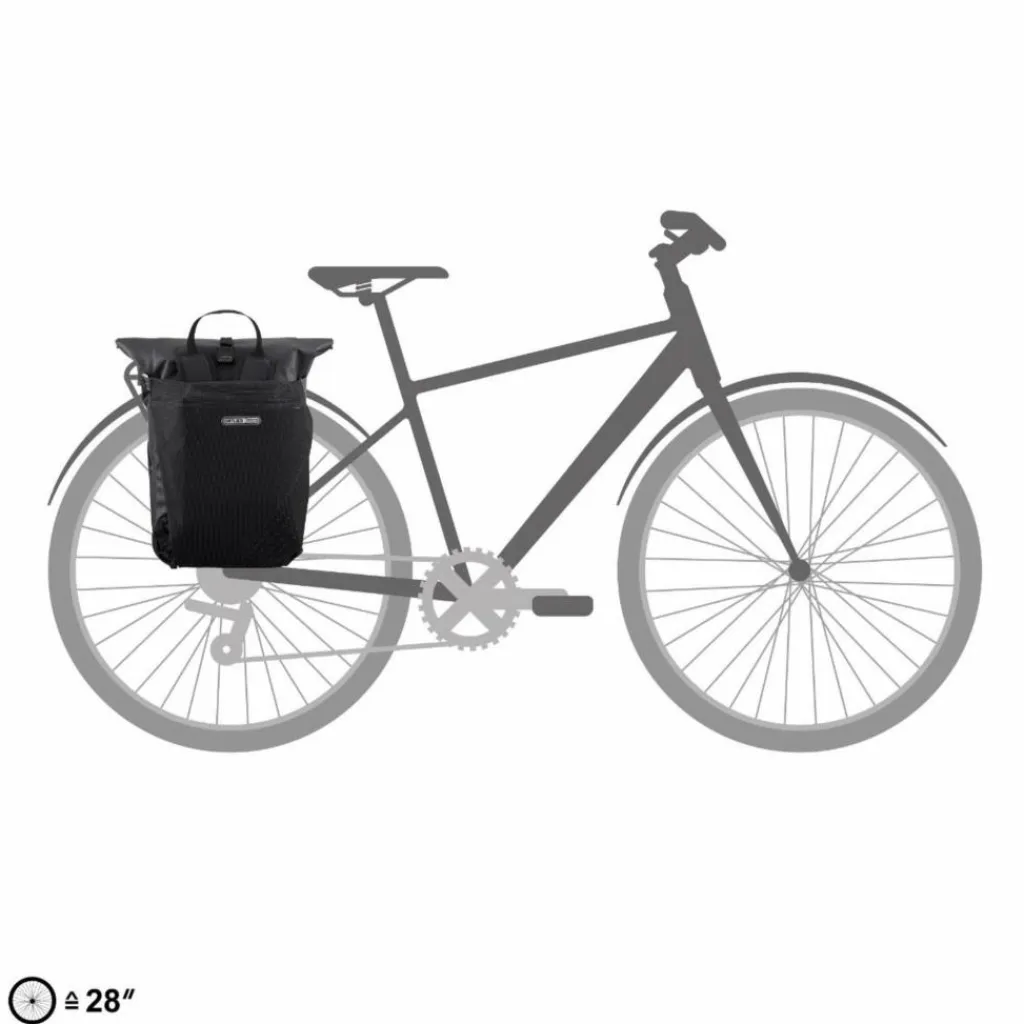 Aufhängung für Gepäckträger mit einem Rohrdurchmesser von 8 bis 16 mm. Die beiden oberen Haken lassen sich werkzeugfrei auf der aus einem Stück gefertigten Schiene verschieben und durch Anheben des Tragegriffs öffnen. Der untere Arretierungshaken ist ebenfalls auf einer halbelliptischen Schiene individuell anpassbar und werkzeugfrei in 15-Grad-Schritten drehbar. Ein Scheuerschutz im unteren Bereich der Taschen und an der Auflagefläche des Gepäckträgers beugt Abrieb vor.Details