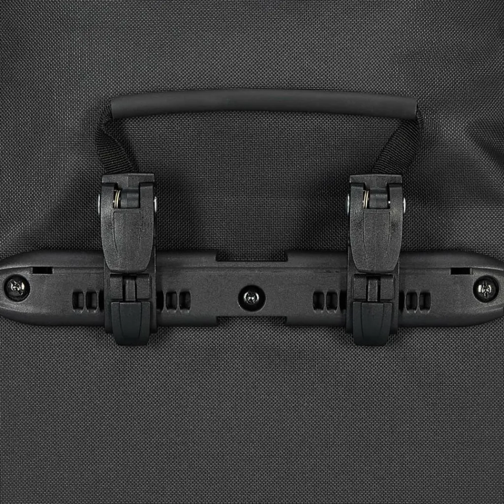 Aufhängung für Gepäckträger mit einem Rohrdurchmesser von 8 bis 16 mm. Die beiden oberen Haken lassen sich werkzeugfrei auf der aus einem Stück gefertigten Schiene verschieben und durch Anheben des Tragegriffs öffnen. Der untere Arretierungshaken ist ebenfalls auf einer halbelliptischen Schiene individuell anpassbar und werkzeugfrei in 15-Grad-Schritten drehbar. Ein Scheuerschutz im unteren Bereich der Taschen und an der Auflagefläche des Gepäckträgers beugt Abrieb vor.